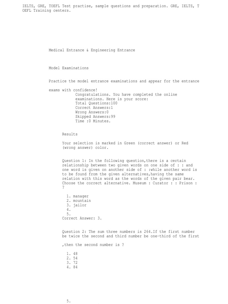 Model Examinations Practice the model entrance examinations and appear for the entrance exams with confidence! Congratulations. You have completed the online examinations. Here is your score: Total Questions:100 Correct Answers:1 Wrong Answers:0 Skipped Answers:99 Time :0 Minutes. Results Your selection is marked in Green (correct answer) or Red (wrong answer) color. Question 1: In the following question,there is a certain relationship between two given words on one side of : : and one word is given on another side of : :while another word is to be found from the given alternatives,having the same relation with this word as the words of the given pair bear. Choose the correct alternative. Museum : Curator : : Prison : ? 1. manager 2. mountain 3. jailor 4. 5. Correct Answer: 3. Question 2: The sum three numbers is 264.If the first number be twice the second and third number be one-third of the first ,then the second number is ? 1. 2. 3. 4. 48 54 72 84