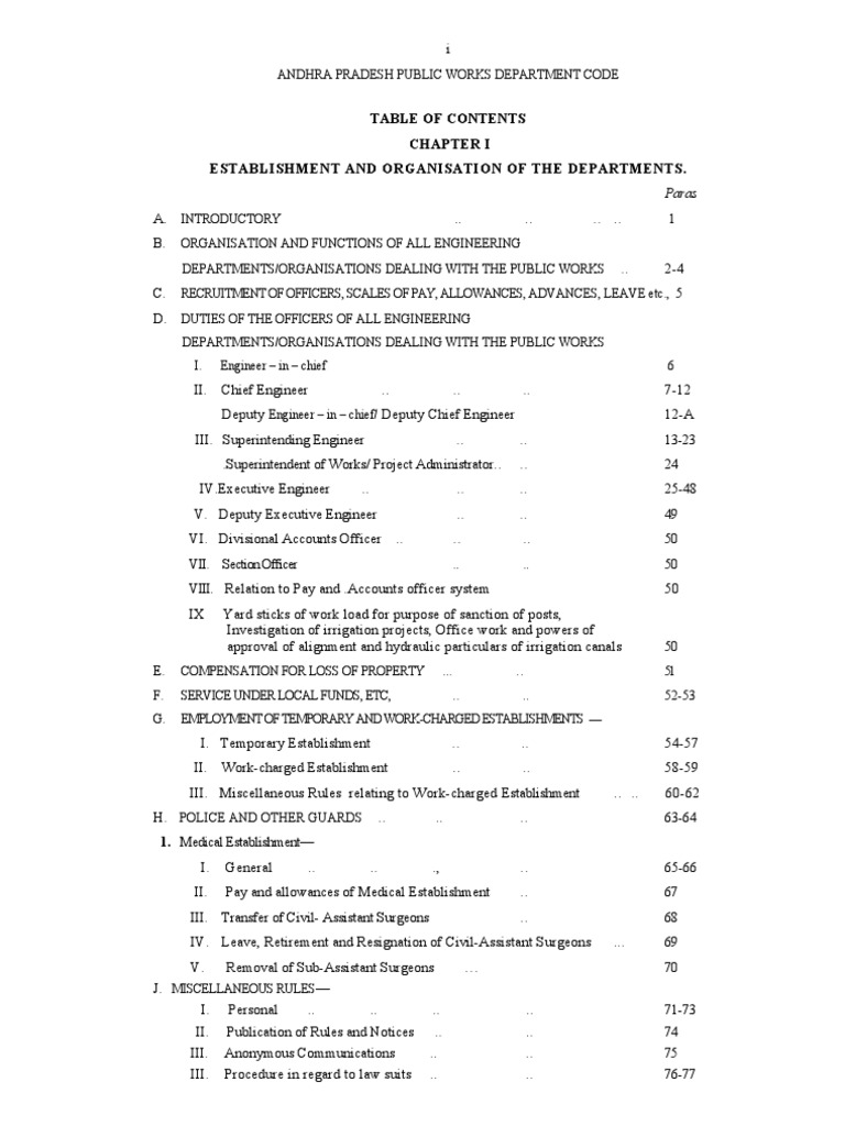 x Government buildings are leased out to private individuals. Form of Agreement for adoption in cases in which Government buildings belonging to private parties or local bodies are leased by Government for occupation by their officers or offices. Form of order of grant of all kinds of Government lands in charge of the Public works Department for temporary occupation for Agricultural purposes Form of order of grant of all kinds of Government lands in charge of the Public works Department for temporary occupation for Non Agricultural purposes Deleted Destruction of records Deleted Rules regulating the payment of bonus to contractors Deleted Rules regarding the relation of Public works officers to collectors of districts and other local heads of Department. Rules for the construction and maintenance of Zilla Parishad and Panchayat Samithies and municipal roads on canal and channel banks. Ordinary fire rules for Government buildings (Non-residential) Standard scale of electrical fittings for court houses, etc. Standard scale of electrical fittings for Government residences Data statement for calculating rent of buildings Training module to Engineers ( Chapter-1) Rules for Registration of contractors Hiring of Equipment to Contractors and other Private Bodies Natural Disaster management.( Chapter-IV) Guide lines for localization and cropping pattern for major, medium and minor irrigation projects A.P Grama Panchayat, Public or Govt. Ferries rules 2000 and section 57 of A.P.P.R Act 1994. Reservoirs - guide lines for management of flood out flow Guide lines for preparation , submission, appraisal, and clearance of flood management schemes Rules to the AP farmers management irrigation systems ACT 1997. FORMS i. Check slip to accompany estimates (for civil works) for technical sanction ii. Register of Component works iii. Register of Bridges iv. Register of land Acquisition v. Register of Buildings vi. Report of survey committee regarding assessment of present condition of machinery inspected and release value recommended for projects Page No. XIII