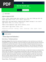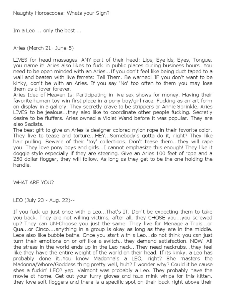 tailbone that is heaven to them where if touched right will actually make them purr...you think I'm bullshitting you? Try it, I dare ya. Leo likes doing doggystyle that's a given. As long as it feels good, but leos also like missionary if they are in love with there lover that is the most intimate position as you two look in each other eyes. Their underware is always..er..interesting to say the least, if they are wearing any. They LIVE for boudoir photography. They LOVE to be photographed. If they can afford a nude or semi nude photo of them..do it now. Leos are born and bred to be porn stars...even if they act prude about it..they have thought about it. The best sex partner is a Scorpio leos love them... Rubies jewels usually are their love. Love to have their hair brushed and played with. You had better be vocal in bed with them...they want to hear how well they are doing. If a Leo has chosen YOU as a mate. Just accept it and enjoy the ride. Be prepared for anything. They have no problem tying you down. They ARE the naughty school teacher, the pirate captain, the gypsy king and Cleopatra all rolled into one.you will always have the best sex ever with a leo Virgo This is the MOST confused sign on the planet. This sign is pretty realistic: No Frills. They love to fuck in showers not because it's kinky...but because of hygenic reasons...they are big into sanitary issues. Every Virgo I have ever met has issues...always going back to hygiene. They have to arrange time in their busy scheduals to have sex...But when a reservation is made...You had better be there on time, if not a little early. With flowers. And Clean. Virgos want to make their partner happy. That's it. USUALLY. You will always get a freaky Virgo. Even so, they will TRY to get YOU to cum. And if they can't make you cum, they will buy someone or something that will. Yes you read that right. They LIVE to masturbate...whether its you rubbing them, them rubbing you...them rubbing against your fox fur coat...whatever! Some Virgos WANT to be punished. They will do naughty things to be caught so they can be punished. They are perfect for Aries who want to punish SOMEBODY. Anybody! Pretend rape scenes also turn on Virgos. As long as they know they are secretly safe. If you have ever seen the Carnival Rape scene in 'Henry & June' this is a Virgo wet dream. Also all Virgos like to see Camel Toes...what's up with that? Sherlock Holmes was probably a Virgo...or a repressed Gemini.