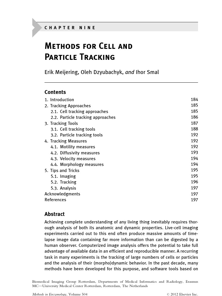 Jaqaman, K., Loerke, D., Mettlen, M., Kuwata, H., Grinstein, S., Schmid, S. L., and Danuser, G. (2008). Robust single-particle tracking in live-cell time-lapse sequences. Nat. Methods 5, 695702. Li, F., Zhou, X., Ma, J., and Wong, S. T. C. (2010). Multiple nuclei tracking using integer programming for quantitative cancer cell cycle analysis. IEEE Trans. Med. Imaging 29, 96105. Matov, A., Applegate, K., Kumar, P., Thoma, C., Krek, W., Danuser, G., and Wittmann, T. (2010). Analysis of microtubule dynamic instability using a plus-end growth marker. Nat. Methods 7, 761768. Meijering, E., Smal, I., and Danuser, G. (2006). Tracking in molecular bioimaging. IEEE Signal Process. Mag. 23, 4653. Meijering, E., Smal, I., Dzyubachyk, O., and Olivo-Marin, J. C. (2008). Time-lapse imaging. In Microscope Image Processing, (Q. Wu, F. A. Merchant, and K. R. Castleman, eds.), pp. 401440. Academic Press, Burlington, MA. pp. 401440, Chapter 15. Meijering, E., Dzyubachyk, O., Smal, I., and van Cappellen, W. A. (2009). Tracking in cell and developmental biology. Semin. Cell Dev. Biol. 20, 894902. Mosig, A., Ja ger, S., Wang, C., Nath, S., Ersoy, I., Palaniappan, K. P., and Chen, S. S. (2009). Tracking cells in life cell imaging videos using topological alignments. Algorithms Mol. Biol. 4, 10. Murray, J. I., Bao, Z., Boyle, T. J., and Waterston, R. H. (2006). The lineaging of fluorescently-labeled Caenorhabditis elegans embryos with StarryNite and AceTree. Nat. Protoc. 1, 14681476. Peng, H. (2008). Bioimage informatics: A new area of engineering biology. Bioinformatics 24, 18271836. Pincus, Z., and Theriot, J. A. (2007). Comparison of quantitative methods for cell-shape analysis. J. Microsc. 227, 140156. Qian, H., Sheetz, M. P., and Elson, E. L. (1991). Single particle tracking: Analysis of diffusion and flow in two-dimensional systems. Biophys. J. 60, 910921. Rittscher, J. (2010). Characterization of biological processes through automated image analysis. Annu. Rev. Biomed. Eng. 12, 315344. , W., and Eils, R. Rohr, K., Godinez, W. J., Harder, N., Wo rz, S., Mattes, J., Tvarusko (2010). Tracking and quantitative analysis of dynamic movements of cells and particles. Cold Spring Harb. Protoc. 2010, pdb.top80. Sacan, A., Ferhatosmanoglu, H., and Coskun, H. (2008). Cell track: An open-source software for cell tracking and motility analysis. Bioinformatics 24, 16471649. Sage, D., Neumann, F. R., Hediger, F., Gasser, S. M., and Unser, M. (2005). Automatic tracking of individual fluorescence particles: Application to the study of chromosome dynamics. IEEE Trans. Image Process. 14, 13721383. Saxton, M. J., and Jacobson, K. (1997). Single-particle tracking: Applications to membrane dynamics. Annu. Rev. Biophys. Biomol. Struct. 26, 373399. Sbalzarini, I. F., and Koumoutsakos, P. (2005). Feature point tracking and trajectory analysis for video imaging in cell biology. J. Struct. Biol. 151, 182195. Shen, H., Nelson, G., Kennedy, S., Nelson, D., Johnson, J., Spiller, D., White, M. R. H., and Kell, D. B. (2006). Automatic tracking of biological cells and compartments using particle filters and active contours. Chemometr. Intell. Lab. Syst. 82, 276282. Smal, I., Meijering, E., Draegestein, K., Galjart, N., Grigoriev, I., Akhmanova, A., van Royen, M. E., Houtsmuller, A. B., and Niessen, W. (2008). Multiple object tracking in molecular bioimaging by Rao-Blackwellized marginal particle filtering. Med. Image Anal. 12, 764777. Smal, I., Loog, M., Niessen, W., and Meijering, E. (2010). Quantitative comparison of spot detection methods in fluorescence microscopy. IEEE Trans. Med. Imaging 29, 282301. Soll, D. R. (1995). The use of computers in understanding how animal cells crawl. Int. Rev. Cytol. 163, 43104.
