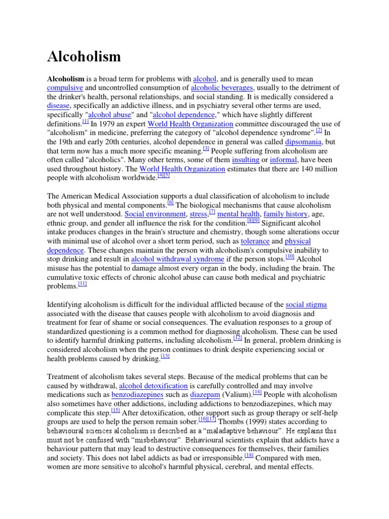 Alcoholism is a broad term for problems with alcohol, and is generally used to mean compulsive and uncontrolled consumption of alcoholic beverages, usually to the detriment of the drinker's health, personal relationships, and social standing. It is medically considered a disease, specifically an addictive illness, and in psychiatry several other terms are used, specifically "alcohol abuse" and "alcohol dependence," which have slightly different definitions.[1] In 1979 an expert World Health Organization committee discouraged the use of "alcoholism" in medicine, preferring the category of "alcohol dependence syndrome".[2] In the 19th and early 20th centuries, alcohol dependence in general was called dipsomania, but that term now has a much more specific meaning.[3] People suffering from alcoholism are often called "alcoholics". Many other terms, some of them insulting or informal, have been used throughout history. The World Health Organization estimates that there are 140 million people with alcoholism worldwide.[4][5] The American Medical Association supports a dual classification of alcoholism to include both physical and mental components.[6] The biological mechanisms that cause alcoholism are not well understood. Social environment, stress,[7] mental health, family history, age, ethnic group, and gender all influence the risk for the condition.[8][9] Significant alcohol intake produces changes in the brain's structure and chemistry, though some alterations occur with minimal use of alcohol over a short term period, such as tolerance and physical dependence. These changes maintain the person with alcoholism's compulsive inability to stop drinking and result in alcohol withdrawal syndrome if the person stops.[10] Alcohol misuse has the potential to damage almost every organ in the body, including the brain. The cumulative toxic effects of chronic alcohol abuse can cause both medical and psychiatric problems.[11] Identifying alcoholism is difficult for the individual afflicted because of the social stigma associated with the disease that causes people with alcoholism to avoid diagnosis and treatment for fear of shame or social consequences. The evaluation responses to a group of standardized questioning is a common method for diagnosing alcoholism. These can be used to identify harmful drinking patterns, including alcoholism.[12] In general, problem drinking is considered alcoholism when the person continues to drink despite experiencing social or health problems caused by drinking.[13] Treatment of alcoholism takes several steps. Because of the medical problems that can be caused by withdrawal, alcohol detoxification is carefully controlled and may involve medications such as benzodiazepines such as diazepam (Valium).[14] People with alcoholism also sometimes have other addictions, including addictions to benzodiazepines, which may complicate this step.[15] After detoxification, other support such as group therapy or self-help groups are used to help the person remain sober.[16][17] Thombs (1999) states according to behavioural sciences alcoholism is described as a maladaptive behaviour. He explains this must not be confused with misbehaviour. Behavioural scientists explain that addicts have a behaviour pattern that may lead to destructive consequences for themselves, their families and society. This does not label addicts as bad or irresponsible.[18] Compared with men, women are more sensitive to alcohol's harmful physical, cerebral, and mental effects.