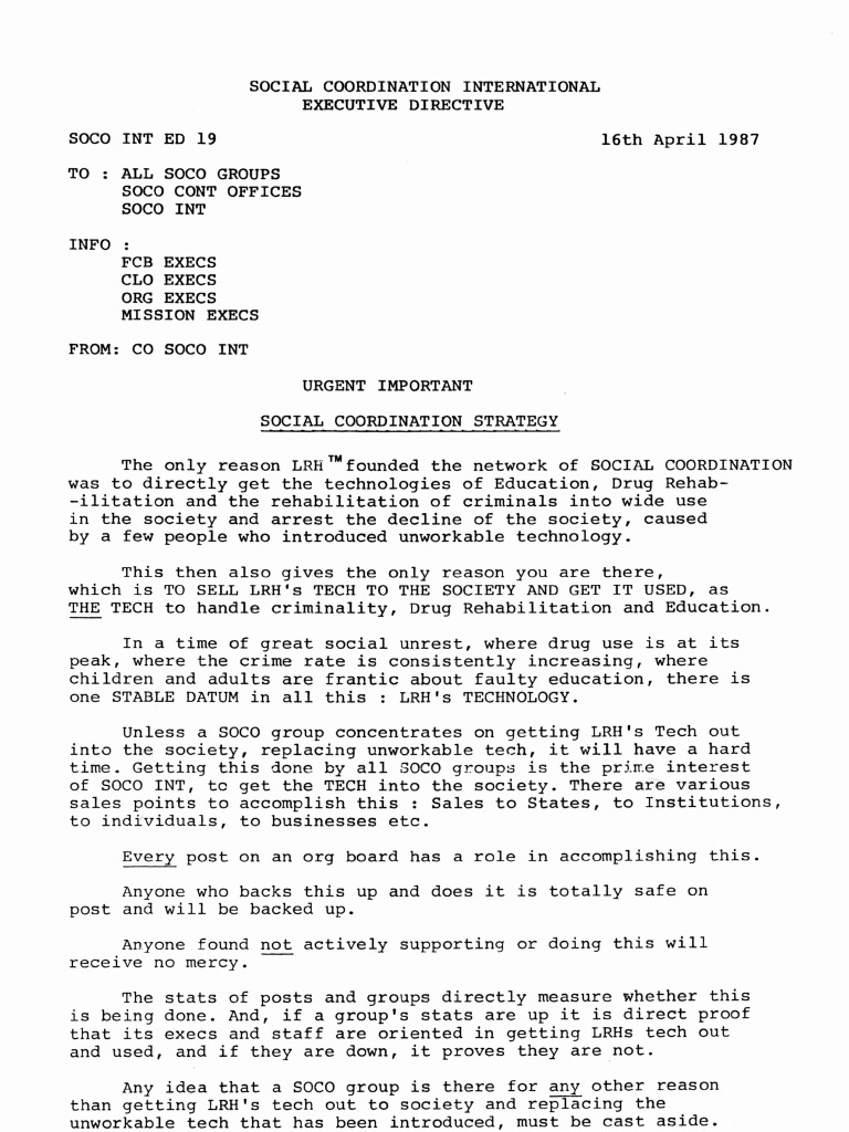 SOCIAL COORDINATION INTERNATIONAL EXECUTIVE DIRECTIVESOCO INT ED 19 16th April 1987TO : ALL SOCO GROUPSSOCO CONT OFFICES SOCO INTINFO :FCB EXECS CLO EXECS ORG EXECS MISSION EXECSFROM: CO SOCO INTURGENT IMPORTANT SOCIAL COORDINATION STRATEGYThe only reason LRH™ founded the network of SOCIAL COORDINATION was to directly get the technologies of Education, Drug Rehabilitation and the rehabilitation of criminals into wide use in the society and arrest the decline of the society, caused by a few people who introduced unworkable technology.This then also gives the only reason you are there, which is TO SELL LRH's TECH TO THE SOCIETY AND GET IT USED, as THE TECH to handle criminality, Drug Rehabilitation and Education.In a time of great social unrest, where drug use is at its peak, where the crime rate is consistently increasing, where children and adults are frantic about faulty education, there is one STABLE DATUM in all this : LRH's TECHNOLOGY.Unless a SOCO group concentrates on getting LRH's Tech out into the society, replacing unworkable tech, it will have a hard time. Getting this done by all SOCO groups is the prime interest of SOCO INT, te get the TECH into the society. There are various sales points to accomplish this : Sales to States, to Institutions, to individuals, to businesses etc.Every post on an org board has a role in accomplishing this.Anyone who backs this up and does it is totally safe on post and will be backed up.Anyone found not actively supporting or doing this will receive no mercy.The stats of posts and groups directly measure whether this is being done. And, if a group's stats are up it is direct proof that its execs and staff are oriented in getting LRHs tech out and used, and if they are down, it proves they are not.Any idea that a SOCO group is there for any other reasonthan getting LRH's tech out to society and replacing the unworkable tech that has been introduced, must be cast aside.You do have the policies on how to go about this. You definitely have the public demand. Who wants a drugged, criminal or stupid society except suppressives.In the teeth of the forces who work to destroy westerncivilisation, you will get nowhere until you begin to work assubversives of the planned subversion.The whole fields of law enforcement, drug handling and education aren't going bad through stupidity.