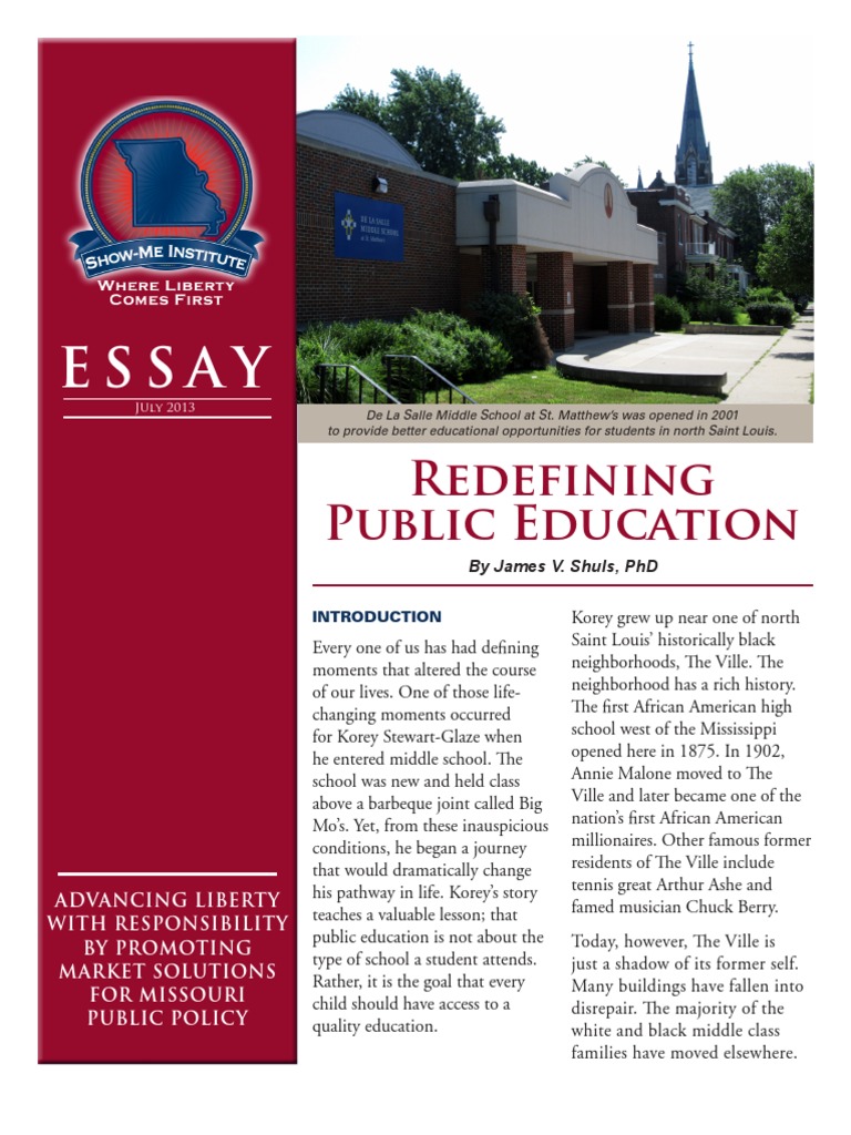 SHOW-ME INSTITUTE I ESSAY cost. Our narrow definition of public education prevents De La Salle from receiving state dollars and prevents more students from experiencing the life-changing moment that Korey had. It is time we redefine public education. It should no longer mean assigning students to a specific type of school, regardless of quality, but rather that we provide access to a quality education, regardless of the type of school delivering that education.
