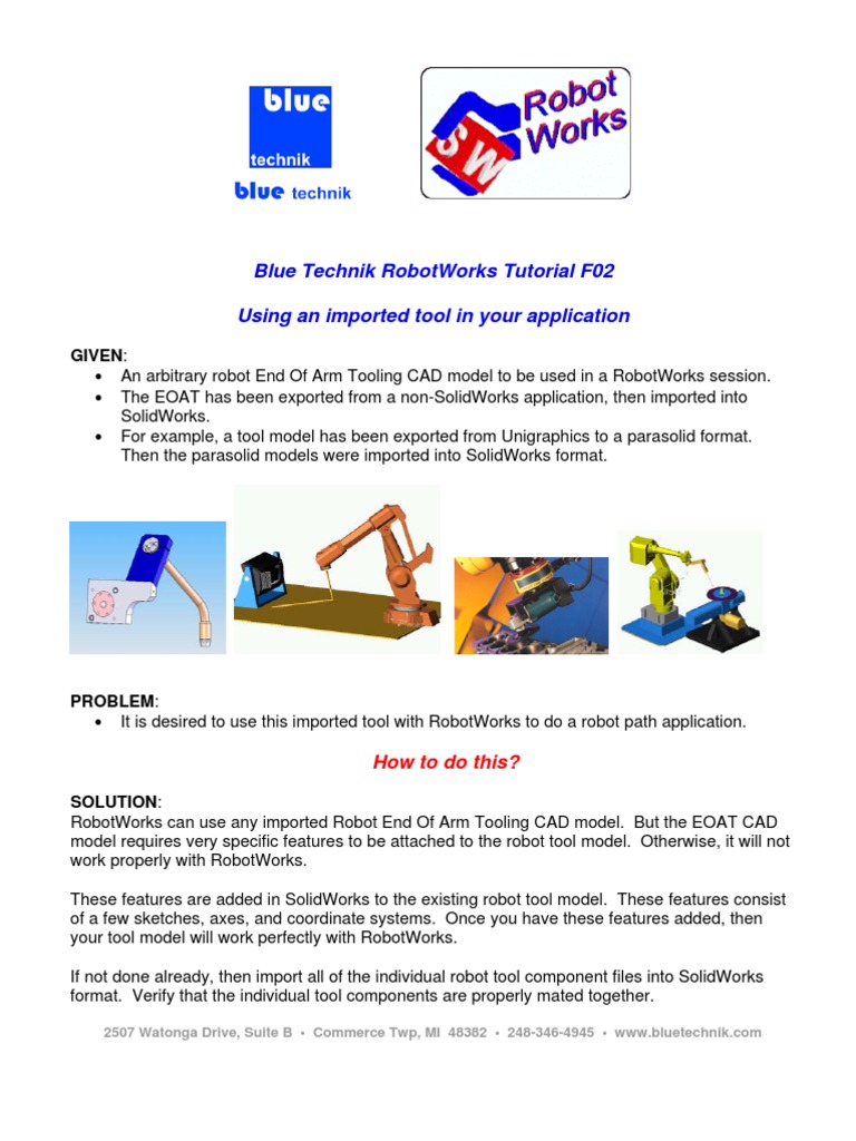 MI 48382 • 248-346-4945 • www. Here we have all of the necessary Tool Markers AND a TCP Coordinate System. 2507 Watonga Drive.bluetechnik.Continue with the process and it is possible to create a RobotWorks-compatible EOAT as shown below.com . Suite B • Commerce Twp.