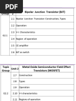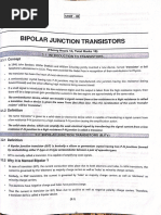 The output characteristics of CC conguration are the plot of output emittercollector voltage VEC to the output emitter current IE for a constant input base current IB . The Ebers-Moll model is basically a physical model describing the currentvoltage properties in terms of the physical mechanism of charge movement within the device. The BJT can be operated as a switch when it is operated in cut-off and saturation region of operations. Under cut-off condition, the BJT behaves like an open circuit and under saturation condition, the transistor behaves like a closed switch. Delay time can be dened as the time required for the current to rise to 10% of its maximum value. Rise time can be dened as the time required for the current to rise through the active region from 10% to 90% of its maximum value. ON time can be dened as the total time required for the device to turn-on. On time is the sum of delay time and rise time. Storage time can be dened as the time elapsed between the transition of input (from logical high to logical zero) and the time when output current has dropped to 90% of its maximum value. Fall time can be dened as the time required for the current to fall through the active region from 90% to 10% of its maximum value. OFF time can be dened as the total time required for the device to turn-off. OFF time is the sum of storage time and fall time. The delay in the switching characteristic of BJT is due to inherent capacitances. They are - Emitter-base junction transition capacitance - Collector-base junction diffusion capacitance - Time required for the collector current to rise to 10% of its maximum value. Reason for Storage time - When the transistor is in saturation condition, it posseses excess minority charge carriers in the base. In such a situation, transistor cannot respond until the excess minority carriers have been removed from the base region.