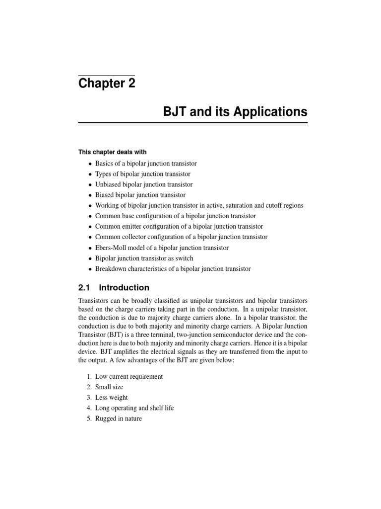 Transistors can be broadly classied as unipolar transistors and bipolar transistors based on the charge carriers taking part in the conduction. In a unipolar transistor, the conduction is due to majority charge carriers alone. In a bipolar transistor, the conduction is due to both majority and minority charge carriers. A Bipolar Junction Transistor (BJT) is a three terminal, two-junction semiconductor device and the conduction here is due to both majority and minority charge carriers. Hence it is a bipolar device. BJT amplies the electrical signals as they are transferred from the input to the output. A few advantages of the BJT are given below: 1. Low current requirement 2. Small size 3. Less weight 4. Long operating and shelf life 5. Rugged in nature