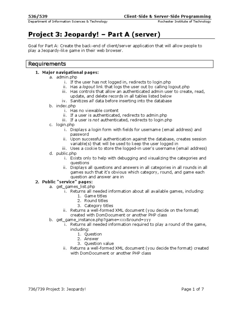 1. Required files: a. index.html i. Located on gibson ii. Obtains all data dynamically from the server application (on nova) iii. Presents the user with a list of all available games (which also shows the rounds and categories) iv. Allows the user to select which game to play v. When the user has made a choice of which game to play, requests all data for the first round of that game and stores that data (in an array/object) vi. Keeps track of game state (In this case, game state means displaying all of the available categories and questions. If a question is available to be chosen, the point value will be visible. If a question has already been chosen, there should be a visual indicator that the question is not available.) vii. When the round is over, gives the user the option of continuing to the next round or going back to the main menu viii. Includes a reset button that allows the user to go back to the main menu at any time ix. All content is created and appended dynamically with JavaScript/jQuery x. Detects which browser is being used, and if the content doesn't display correctly in that browser, redirects to an error page or presents an error message xi. Uses jQuery extensively for dynamic creation, animation, form validation, browser detection and redirection, etc xii. Uses at least two jQuery plugins that augment your project (they should not be gratuitous additions!) xiii. Uses AJAX to retrieve data from the server application b. submit.html i. Presents a form to the user to submit a new question and answer ii. Lets the user select which game, round, and category (and maybe even value) the suggestion is for iii. Uses extensive HTML5 and jQuery form validation iv. Submits the data to a PHP script on the server that does something with it, e.g. emails you (the developer), saves it to the database, etc c. help.html i. Gives a brief summary of the rules for the user as you have adapted them for your application (the rules for the 'real' game show can be found at http://en.wikipedia.org/wiki/Jeopardy!) ii. Lists any sources that you used when writing your questions and answers