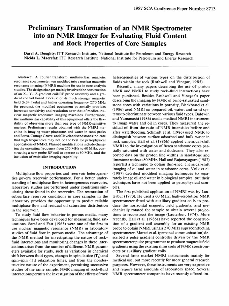 (Mansfield and Chapman, 1986). However, these gradient systems tend to require more space within the magnet bore. All of the petrographic imaging studies published to date have been performed at frequencies much lower than 270 MHz. Our plans involve obtaining a superconducting magnet power supply to enable us to reduce our magnetic field to operate at a lower frequency. We have constructed a new R F coil for the imaging probe that is more nearly ideal in its shape. This new coil and the tuning and matching circuitry operate at 60 MHz for protons. At this frequency, the new T2 values should be more than 4 times longer, allowing ample time for gradient switching to image our plug samples. We are also adding multislice capability to our NMRI by building circuitry to shift the spectrometer frequency during the interval between the RF pulse and the detection period. Under current operation the frequency remains constant, and only a slice at the center of the RF coil is imaged. We are also considering obtaining a new gradient coil system having rise and fall times of 0.3 milliseconds, an order of magnitude better response than our current coil assembly. SUMMARY NMRI has shown potential in the past ^ e a r s for investigating rock-fluid interactions, and newly reported developments suggest that more valuable applications are to come. By modifying an existing high-resolution NMR spectrometer for NMRI, imaging capability has been achieved at much lower cost than is possible with commercial instruments. Preliminary results on sandpacks and sandstone plug samples showed several areas where instrument operation must be modified to improve imaging performance for typical rock samples. ACKNOWLEDGEMENTS This work was supported in part by the Department of Energy under cooperative agreement DE-FC22-83FE60149. We particularly acknowledge the invaluable help of Dr. Tom Mareci of the University of Florida at Gainesville for providing the pulse gradient control board circuitry and NMRI references. REFERENCES Baldwin, B. A. and Yamanashi, W. X. (1986), "Detecting Fluid Movement and Isolation in Reservoir Cores Using Medical NMR Imaging Techniques," Presented at the Fifth SPE/DOE