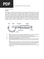 = 0.005 mm (or) 0.0005 cm. 2. The head of a screw is divided into 50 divisions. It advances 1mmwhen screw is turned through 2 rotations. Find the Pitch of the screw and Least count of the screw gauge? (Ans: 0.5mm; 0.01mm) 3. When a screw gauge of Least Count 0.01mm is used to measure the diameter of a nail, the P.S.R. is found to be 1.5mm, and H.S.R is 18. Find the diameter of the nail? Sol: Given : Least Count = 0.01mm P.S.R = 1.5mm H.S.R = 18 To found: Diameter of the nail Formula : Diameter of the nail d = P.S.R. + ( H.S.R x L.C) Calculation: d = 1.5 + ( 18 x 0.01) = 1.5 + 0.18 = 1.68 mm. 4. While measuring the diameter of a lead shot using a screw gauge, the reading on the pitch scale is 7.5mm and that on the head scale is 48. If the least count is 0.01mm and zero error is +0.05mm, find the diameter of the lead shot? Sol: Given : P.S.R = 7.5mm H.S.R = 48 L.C. = 0.01mm Zero error = +0.05 mm To found: Diameter of a Lead Shot Formula : Diameter of a lead shot d = P.S.R + (H.S.R x L.C) error Calculation: d = 7.5 + (48 x 0.01) 0.05 = 7.5 + 0.48 0.05