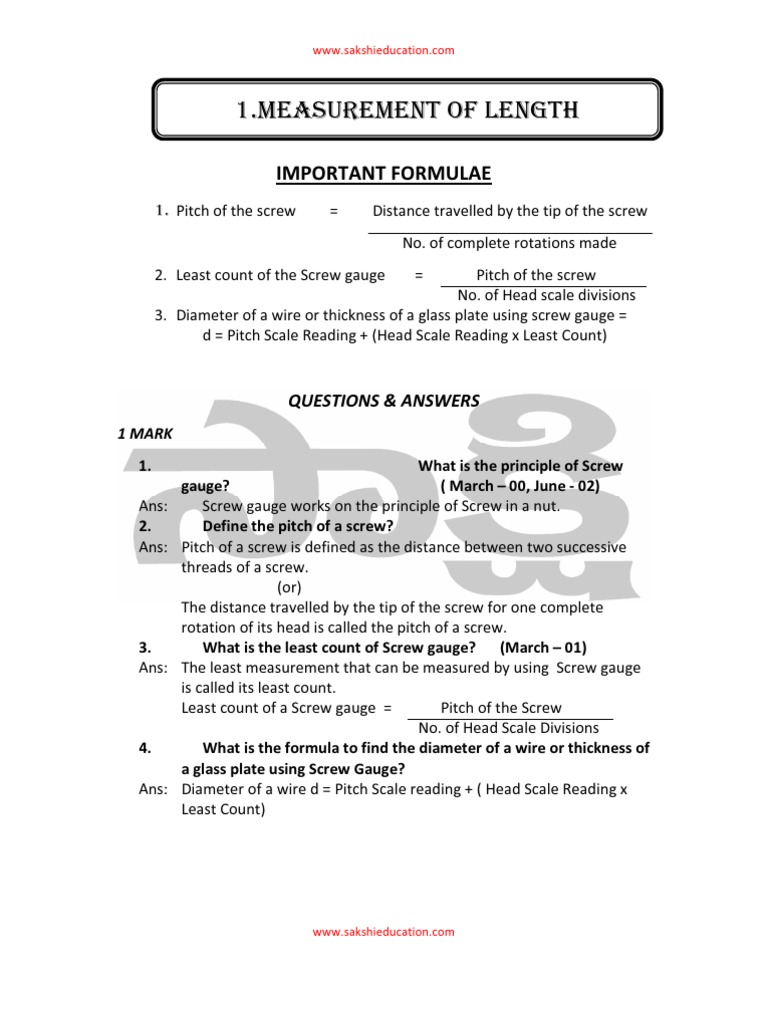 1 MARK 1. Ans: 2. Ans: What is the principle of Screw gauge? ( March 00, June - 02) Screw gauge works on the principle of Screw in a nut. Define the pitch of a screw? Pitch of a screw is defined as the distance between two successive threads of a screw. (or) The distance travelled by the tip of the screw for one complete rotation of its head is called the pitch of a screw. What is the least count of Screw gauge? (March 01) The least measurement that can be measured by using Screw gauge is called its least count. Least count of a Screw gauge = Pitch of the Screw No. of Head Scale Divisions What is the formula to find the diameter of a wire or thickness of a glass plate using Screw Gauge? Diameter of a wire d = Pitch Scale reading + ( Head Scale Reading x Least Count)