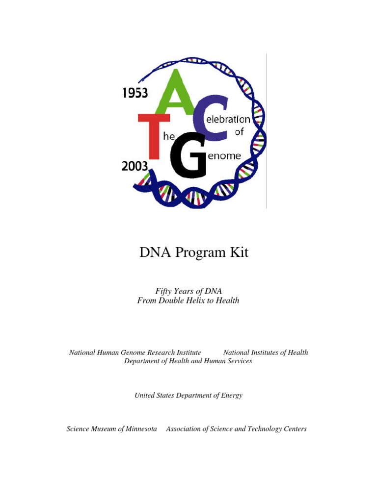 This project was the result of a relatively brief but rewarding collaboration between individuals at a number of public and private institutions. Its goal was to establish a link between science education centers and existing science research programs thus providing an avenue for sharing current research results with the public. The DNA Kits have received overwhelming support from museum participants, sponsors and donors. We hope that this project encourages other museum educators to seek out collaborations that foster current science initiatives. Kris Wetterstrand and Jane Peterson at the National Human Genome Research Institute (NHGRI) in the National Institutes of Health (NIH) initially crafted the concept for this project when they began planning a series of events celebrating the essential completion of the Human Genome Project, the 50th -anniversary of Watson and Cricks description of the structure of DNA and the announcement of the new NHGRI plan for genomic research. They were interested in extending the celebration beyond the Washington, D.C. area and contacted Wendy Pollock at the Association of Science and Technology Centers (ASTC) hoping to illicit some help in attracting museums nationwide to participate in the event. Wendy contacted J. Newlin at the Science Museum of Minnesota because she knew they had been successful in developing hands-on biology exhibits and programs in a public institution. A proposal for the development of DNA kits, which would contain a variety of activities and content information about DNA, sequencing and the Human Genome Project was drafted and funds allocated by NHGRI and various donors acknowledged here. The end result is this kit - full of information and fun ideas to use during the month of April, 2003 to help celebrate two simultaneous historical events, but can also be used throughout the year as an addition to public programming or education programs. Our thanks to Kris, Jane and Wendy for initiating this exciting and worthwhile project. It has been a pleasure to work with each of you and we look forward to future collaborations and endeavors. We are indebted to a number of individuals who helped to make the DNA Program Kits possible. At the Science Museum of Minnesota (SMM), the graphics team of Pam Ebersole, Brent Shipley, Craig Theisen, Jay Higashi and Lonnie Broden were responsible for creating and developing the graphic panels used in the kit. A huge thank you to all of the SMM volunteers who donated their time to assemble the kits, we would not have been able to complete this project on time without their help. Bob Blakesley at the NIH Intramural Sequencing Center was gracious enough to provide expertise, photos and content information about DNA sequencing and the cystic fibrosis gene. Daryl Pritchard and Susan Vasquez of the NHGRI provided helpful comments regarding this manual. Bob Fulton at the Washington University Genome Sequencing Center and Lisa Marinelli at the Whitehead Institute/MIT Center for Genome Research