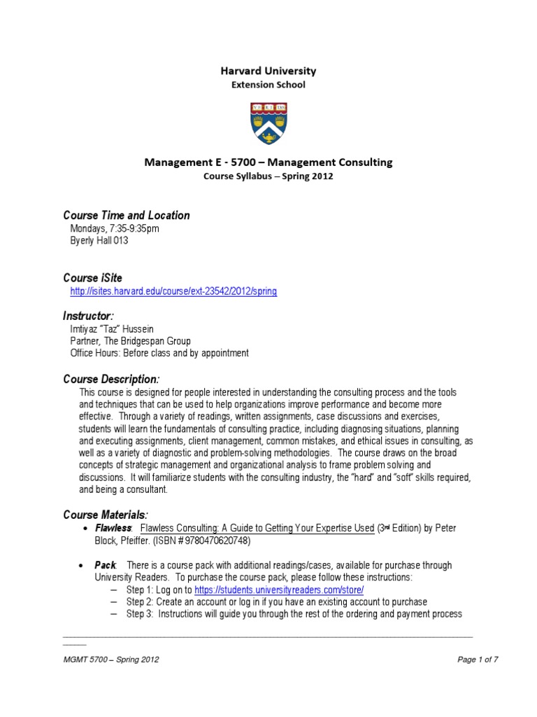 This course is designed for people interested in understanding the consulting process and the tools and techniques that can be used to help organizations improve performance and become more effective. Through a variety of readings, written assignments, case discussions and exercises, students will learn the fundamentals of consulting practice, including diagnosing situations, planning and executing assignments, client management, common mistakes, and ethical issues in consulting, as well as a variety of diagnostic and problem-solving methodologies. The course draws on the broad concepts of strategic management and organizational analysis to frame problem solving and discussions. It will familiarize students with the consulting industry, the hard and soft skills required, and being a consultant. Flawless: Flawless Consulting: A Guide to Getting Your Expertise Used (3rd Edition) by Peter Block, Pfeiffer. (ISBN # 9780470620748) Pack: There is a course pack with additional readings/cases, available for purchase through University Readers. To purchase the course pack, please follow these instructions: Step 1: Log on to [Link] Step 2: Create an account or log in if you have an existing account to purchase Step 3: Instructions will guide you through the rest of the ordering and payment process