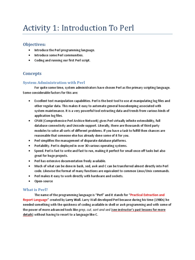 The name of the programming language is Perl and it stands for Practical Extraction and Report Language created by Larry Wall. Larry Wall developed Perl because during his time (1980s) he needed something with the quickness of coding available in shell or awk programming and with some of the power of more advanced tools like grep, cut, sort and sed (see instructors past lessons for more details) without having to resort to a language like C.