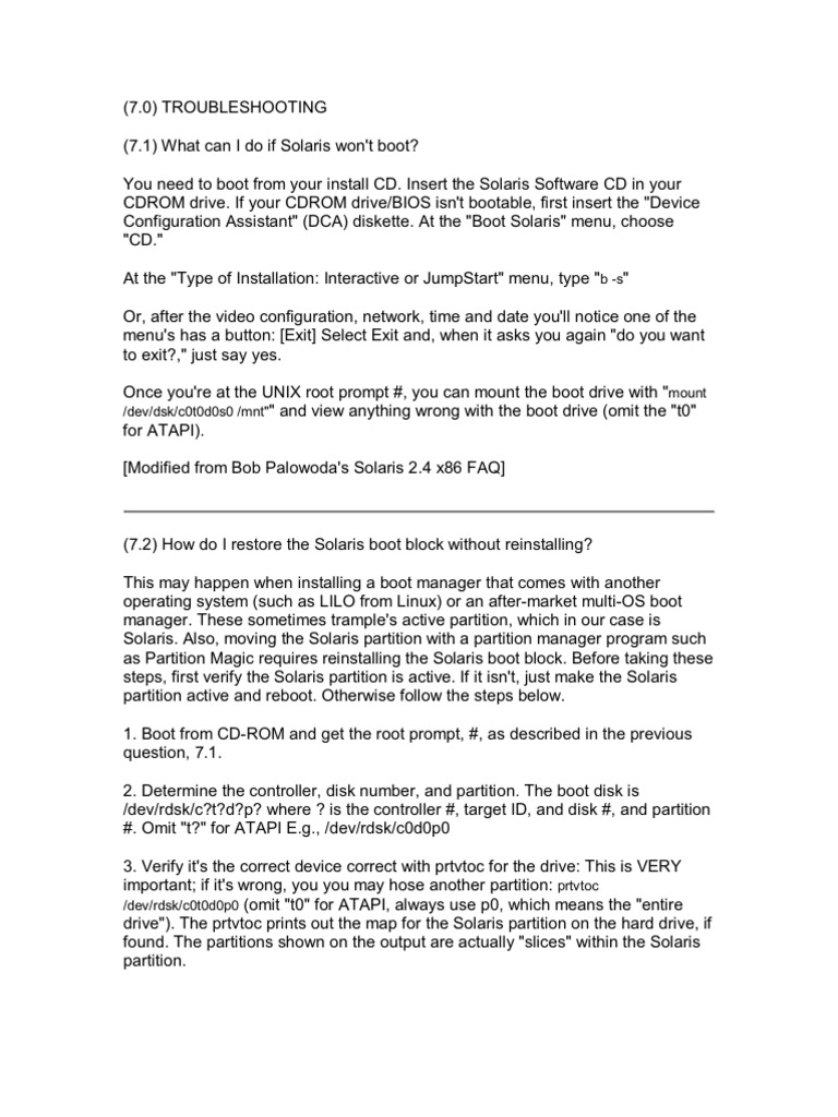 (omit "t0" for ATAPI) 5. Finally, remove your CDROM and diskette media and type "/sbin/shutdown -i6" to reboot. The Solaris Multiple Device Boot Menu should appear after rebooting. If not, you can always to an upgrade (re-)install. Note: This procedure does NOT make your Solaris partition active again (sometimes needed after installing another operating system, such as Windows, on the same disk), it just writes to your bootblock IN your Solaris partition. To learn more about the Solaris boot process, read the boot(1M) man page. (7.3) What can I do during the Solaris/x86 booting sequence? Starting with Solaris 10 06/06, Solaris now uses GRUB to boot, making the answer below obsolete. That means you can boot to multiple partitions, with multiple instances of Solaris and other operating systems (such as Linux and Windows) Step #1: Boot loader If you have multiple partitions, the boot loader in the Solaris partition will come up and ask you which partition you want to boot. This partition must be the active partition, or at least be marked active by a third-party boot manager before this boot loader receives control (not all boot managers have this feature). If you don't answer in so many seconds, it boots Solaris. This boot manager is pretty basic. It has no customization. You can't change the default boot partition to one other than Solaris, you can't change the timeout value, and you can't change the partition descriptions. But it gets the job done. Step #2: Device Configuration Assistant (DCA) This will ask you to press ESC if you want to change stuff. This is to make up for the fact that x86 machines don't have a nice OpenBOOT chip to sort out REAL "Plug and Play". Basically, in Solaris x86, the Device Assistant seems to set up certain things in /boot/solaris. This is so the "real" OS has some common format to examine for devices, instead of having lots of nasty x86 hardware specific stuff. That way, Sun can keep the main OS somewhat hardware independent, and keep it very close to the Sparc version. The "Assistant" can actually been of assistance. If you select "partial scan", then "Device tasks", and then "View/Edit Devices", it will tell you what Solaris THINKS your devices are, and where they are at. Quite useful, when Solaris gets completely lost, and you're wondering if it's your fault, or what. Otherwise, it can give you a warm fuzzy feeling, if you select "Full Scan", and you see all your devices properly recognized. Step #3: OS Boot Well, actually, the "Boot Assistant". The interface is similar, but not identical, to SPARC Solaris' OpenBoot 'boot' command. The main differences I notice are: