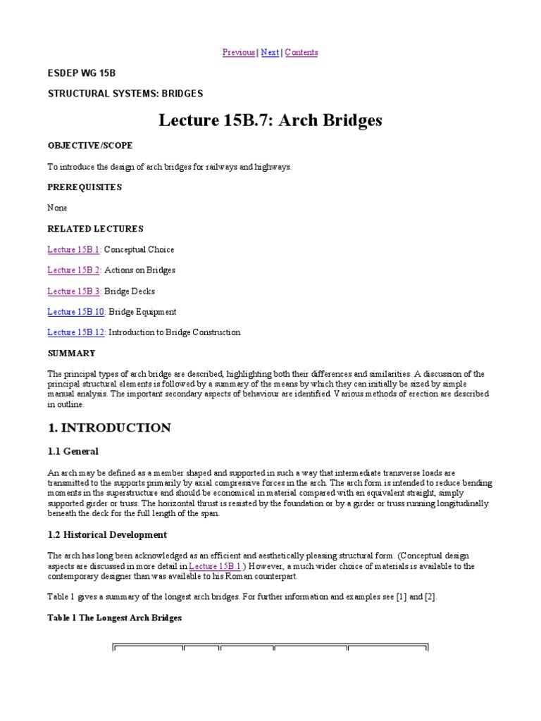 OBJECTIVE/SCOPE To introduce the design of arch bridges for railways and highways. PREREQUISITES None RELATED LECTURES Lecture 15B.1: Conceptual Choice Lecture 15B.2: Actions on Bridges Lecture 15B.3: Bridge Decks Lecture 15B.10: Bridge Equipment Lecture 15B.12: Introduction to Bridge Construction SUMMARY The principal types of arch bridge are described, highlighting both their differences and similarities. A discussion of the principal structural elements is followed by a summary of the means by which they can initially be sized by simple manual analysis. The important secondary aspects of behaviour are identified. Various methods of erection are described in outline.