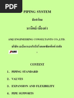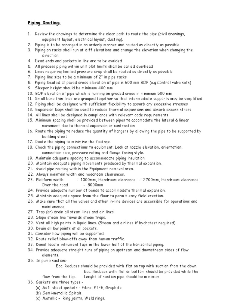 1. 2. 3. 4. 5. 6. 7. 8. 9. 10. 11. 12. 13. 14. 15. 16. 17. 18. 19. 20. 21. 22. 23. 24. 25. 26. 27. 28. 29. 30. 31. 32. 33. 34. 35. Review the drawings to determine the clear path to route the pipe (civil drawings, equipment layout, electrical layout, ducting). Piping is to be arranged in an orderly manner and routed as directly as possible Piping on racks shall run at diff elevations and change the elevation when changing the direction Dead ends and pockets in line are to be avoided All process piping within unit plot limits shall be caried overhead Lines requiring limited pressure drop shall be routed as directly as possible Piping line size to be a minimum of 2 in pipe racks Piping located at paved areas elevation of pipe is 600 mm BOP (e.g Control valve sets) Sleeper height should be minimum 400 mm BOP elevation of pipe which is running on graded areas in minimum 500 mm Small bore thin lines are grouped together so that intermediate supports may be simplified Piping shall be designed with sufficient flexibility to absorb any excessive stresses Expansion loops shall be used to reduce thermal expansions and absorb excess stress All lines shall be designed in compliance with relevant code requirements Minimum spacing shall be provided between pipes to accomodate the lateral & linear movement due to thermal expansion or contraction Route the piping to reduce the quantity of hangers by allowing the pipe to be supported by building steel. Route the piping to minimise the footage. Check the piping connections to equipment. Look at nozzle elevation, orientation, connection size, pressure rating and flange facing style. Maintain adequate spacing to accommodate piping insulation. Maintain adequate piping movements produced by thermal expansion. Avoid pipe routing within the Equipment removal area. Always maintain width and headroom clearances. Platform width - 1000mm, Headroom clearance - 2200mm, Headroom clearance Over the road - 8000mm Provide adequate number of bends to accommodate thermal expansion. Maintain adequate space from the floor to permit easy field erection. Make sure that all the valves and other in-line devices are accessible for operations and maintanence. Trap (or) drain all steam lines and air lines. Slope steam line towards steam traps. Vent all high points in liquid lines. (Steam and airlines if hydrotest required). Drain all low points at all pockets. Consider how piping will be supported. Route relief blow-offs away from human traffic. Donot locate intrument taps in the lower half of the horizontal piping. Provide adequate straight runs of piping on upstream and downstream sides of flow elements. In pump suction:Ecc. Reduces should be provided with flat on top with suction from the down. Ecc. Reduces with flat on bottom should be provided while the flow from the top. Lenght of suction pipe should be minimum. Gaskets are three types:(a) Soft sheet gaskets - Fibre, PTFE, Graphite (b) Semi-metallic Spirals. (c) Metallic - Ring joints, Weld rings.