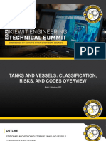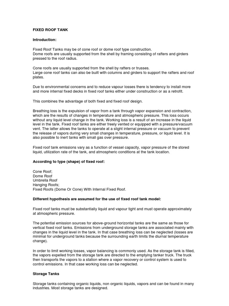 Dome roofs are usually supported from the shell by framing consisting of rafters and girders pressed to the roof radius. Cone roofs are usually supported from the shell by rafters or trusses. Large cone roof tanks can also be built with columns and girders to support the rafters and roof plates. Due to environmental concerns and to reduce vapour losses there is tendency to install more and more internal fixed decks in fixed roof tanks either under construction or as a retrofit. This combines the advantage of both fixed and fixed roof design. Breathing loss is the expulsion of vapor from a tank through vapor expansion and contraction, which are the results of changes in temperature and atmospheric pressure. This loss occurs without any liquid level change in the tank. Working loss is a result of an increase in the liquid level in the tank. Fixed roof tanks are either freely vented or equipped with a pressure/vacuum vent. The latter allows the tanks to operate at a slight internal pressure or vacuum to prevent the release of vapors during very small changes in temperature, pressure, or liquid level. It is also possible to inert tanks with small gas over pressure. Fixed roof tank emissions vary as a function of vessel capacity, vapor pressure of the stored liquid, utilization rate of the tank, and atmospheric conditions at the tank location. According to type (shape) of fixed roof: Cone Roof; Dome Roof Umbrella Roof Hanging Roofs; Fixed Roofs (Dome Or Cone) With Internal Fixed Roof. Different hypothesis are assumed for the use of fixed roof tank model: Fixed roof tanks must be substantially liquid and vapour tight and must operate approximately at atmospheric pressure. The potential emission sources for above-ground horizontal tanks are the same as those for vertical fixed roof tanks. Emissions from underground storage tanks are associated mainly with changes in the liquid level in the tank. In that case breathing loss can be neglected (losses are minimal for underground tanks because the surrounding earth limits the diurnal temperature change). In order to limit working losses, vapor balancing is commonly used. As the storage tank is filled, the vapors expelled from the storage tank are directed to the emptying tanker truck. The truck then transports the vapors to a station where a vapor recovery or control system is used to control emissions. In that case working loss can be neglected. Storage Tanks Storage tanks containing organic liquids, non organic liquids, vapors and can be found in many industries. Most storage tanks are designed.