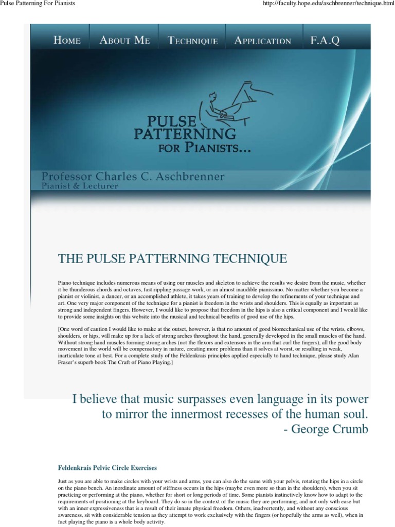 A: Indeed! Im going to list for you just some of the comments and reactions I have heard over the years: I am impressed with the technique! Its such an excellent way to get students movingto begin breathing and feeling the music, especially those students with fixated postures. Having a back problem, I am deeply interested in Pulse Patterning. There are so many valuable suggestions that can help teachers free their students from immobility that both interferes with musical performance and endangers pianists. This is the first time Ive ever felt musical! Im a physical therapist, as well as an organist and piano teacher, and I know and use the (Feldenkrais) exercises; never did I imagine that I could coordinate the one with the other! Ooh, I dont know what to do with all this (new) dynamic potential! Pulse Patterning makes senselike a rediscovery of what ought to be natural to us. It helps one find a pattern for oneself as well as for the music, and it creates a sense of freedom on the piano bench. Home | About Me | Technique | Application | FAQ Copyright 2009