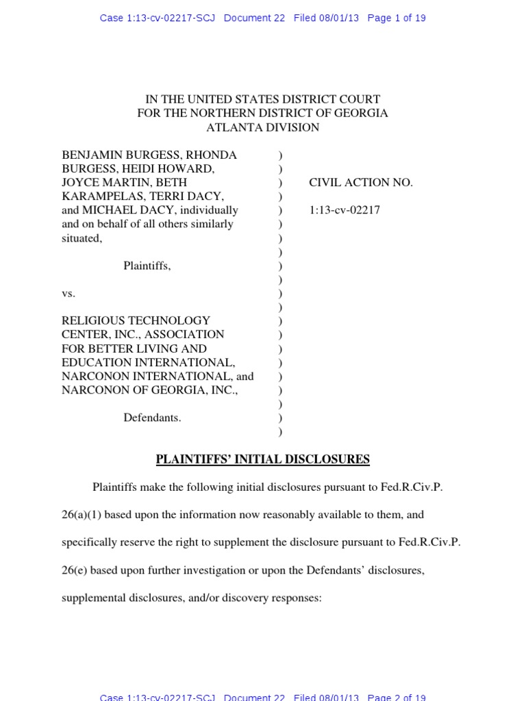 IN THE UNITED STATES DISTRICT COURT FOR THE NORTHERN DISTRICT OF GEORGIA ATLANTA DIVISION BENJAMIN BURGESS, RHONDA ) BURGESS, HEIDI HOWARD, ) JOYCE MARTIN, BETH ) CIVIL ACTION NO. KARAMPELAS, TERRI DACY, ) and MICHAEL DACY, individually ) 1:13-cv-02217 and on behalf of all others similarly ) situated, ) ) Plaintiffs, ) ) vs. ) ) RELIGIOUS TECHNOLOGY ) CENTER, INC., ASSOCIATION ) FOR BETTER LIVING AND ) EDUCATION INTERNATIONAL, ) NARCONON INTERNATIONAL, and ) NARCONON OF GEORGIA, INC., ) ) Defendants. ) )