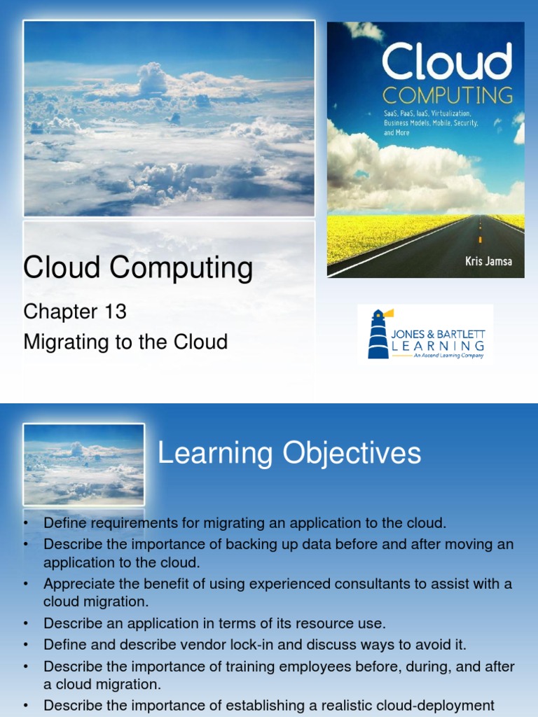 Define requirements for migrating an application to the cloud. Describe the importance of backing up data before and after moving an application to the cloud. Appreciate the benefit of using experienced consultants to assist with a cloud migration. Describe an application in terms of its resource use. Define and describe vendor lock-in and discuss ways to avoid it. Describe the importance of training employees before, during, and after a cloud migration. Describe the importance of establishing a realistic cloud-deployment schedule. Discuss key budget factors impacted by the cloud. Discuss potential IT governance issues related to the cloud. Define and describe cloud bursting.