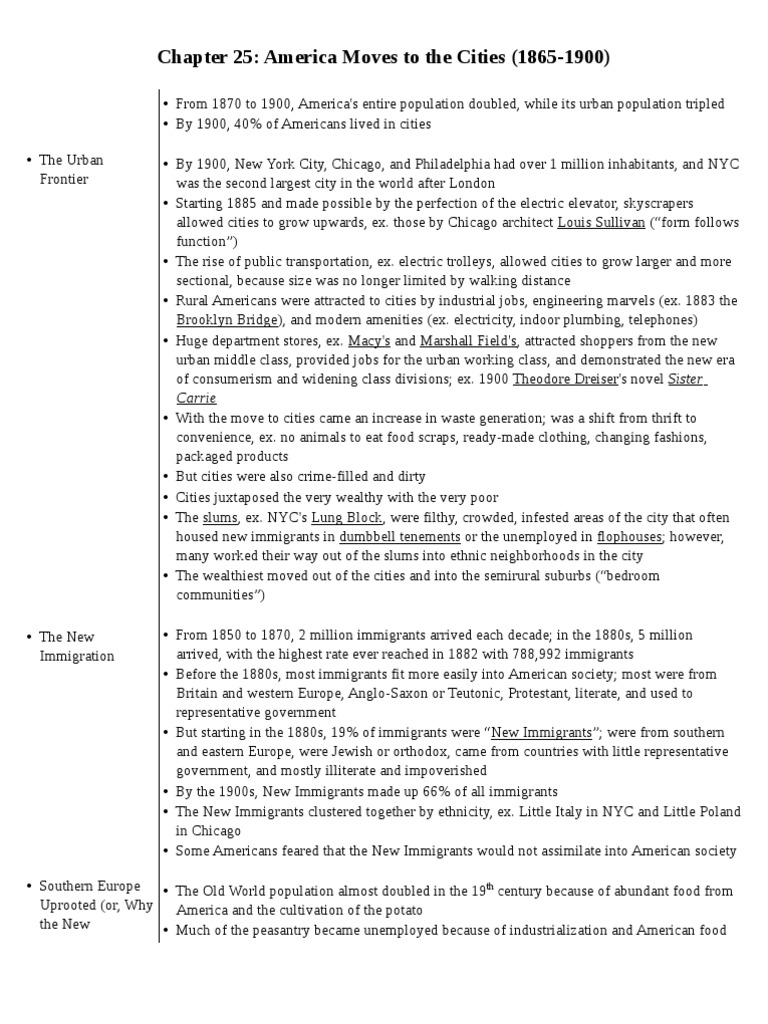 From 1870 to 1900, America's entire population doubled, while its urban population tripled By 1900, 40% of Americans lived in cities The Urban Frontier By 1900, New York City, Chicago, and Philadelphia had over 1 million inhabitants, and NYC was the second largest city in the world after London Starting 1885 and made possible by the perfection of the electric elevator, skyscrapers allowed cities to grow upwards, ex. those by Chicago architect Louis Sullivan (form follows function) The rise of public transportation, ex. electric trolleys, allowed cities to grow larger and more sectional, because size was no longer limited by walking distance Rural Americans were attracted to cities by industrial jobs, engineering marvels (ex. 1883 the Brooklyn Bridge), and modern amenities (ex. electricity, indoor plumbing, telephones) Huge department stores, ex. Macy's and Marshall Field's, attracted shoppers from the new urban middle class, provided jobs for the urban working class, and demonstrated the new era of consumerism and widening class divisions; ex. 1900 Theodore Dreiser's novel Sister Carrie With the move to cities came an increase in waste generation; was a shift from thrift to convenience, ex. no animals to eat food scraps, ready-made clothing, changing fashions, packaged products But cities were also crime-filled and dirty Cities juxtaposed the very wealthy with the very poor The slums, ex. NYC's Lung Block, were filthy, crowded, infested areas of the city that often housed new immigrants in dumbbell tenements or the unemployed in flophouses; however, many worked their way out of the slums into ethnic neighborhoods in the city The wealthiest moved out of the cities and into the semirural suburbs (bedroom communities) From 1850 to 1870, 2 million immigrants arrived each decade; in the 1880s, 5 million arrived, with the highest rate ever reached in 1882 with 788,992 immigrants Before the 1880s, most immigrants fit more easily into American society; most were from Britain and western Europe, Anglo-Saxon or Teutonic, Protestant, literate, and used to representative government But starting in the 1880s, 19% of immigrants were New Immigrants; were from southern and eastern Europe, were Jewish or orthodox, came from countries with little representative government, and mostly illiterate and impoverished By the 1900s, New Immigrants made up 66% of all immigrants The New Immigrants clustered together by ethnicity, ex. Little Italy in NYC and Little Poland in Chicago Some Americans feared that the New Immigrants would not assimilate into American society