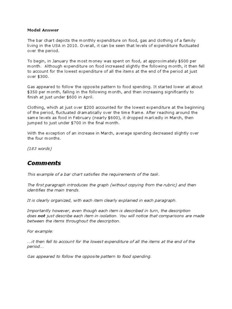 This example of a bar chart satisfies the requirements of the task. The first paragraph introduces the graph (without copying from the rubric) and then identifies the main trends. It is clearly organized, with each item clearly explained in each paragraph. Importantly however, even though each item is described in turn, the description does not just describe each item in isolation. You will notice that comparisons are made between the items throughout the description. For example: ...it then fell to account for the lowest expenditure of all the items at the end of the period... Gas appeared to follow the opposite pattern to food spending.