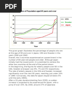 proportion of elderly people by: Anonymous The graph compares the percentage of elderly people in USA, Japan and Sweden during a 100 years period from 1940 to 2040. Generally speaking the proportion of 65 and over aged people in all three countries distinctly increased during the mentioned period. According to the graph Japan's figure beginning from approximately 5% in 1940 after a period of slightly rising experienced a dramatic increase in the last 10 years and reached to almost 27% in 2040 which is the highest point among all countries. The graph shows that although the percentage of elderly people in USA in 1940 was near 9% which was more than the others, at the end of the period it appeared as the lowest by approximately 25%. The Sweden's figure came between others. It can be predicted from the graph that in the next future years the proportion of elders will hit a pick.