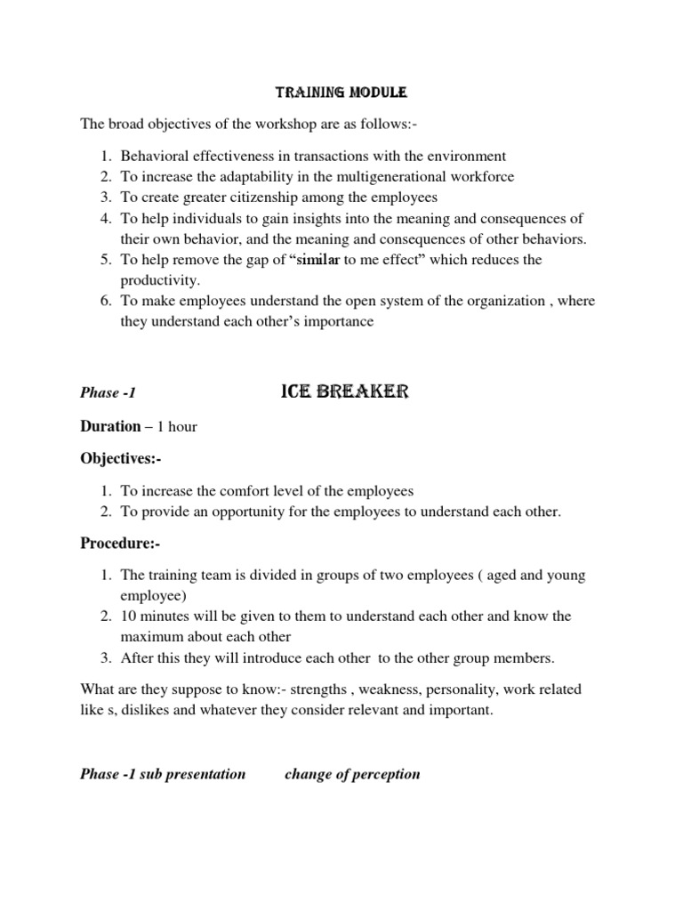 1. To increase the comfort level of the employees 2. To provide an opportunity for the employees to understand each other. Procedure:1. The training team is divided in groups of two employees ( aged and young employee) 2. 10 minutes will be given to them to understand each other and know the maximum about each other 3. After this they will introduce each other to the other group members. What are they suppose to know:- strengths , weakness, personality, work related like s, dislikes and whatever they consider relevant and important.