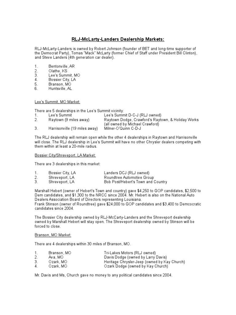 This is the information I gathered on the impact of the Chrysler closings on the markets that RLJ-McLarty-Landers serves. The data indicates that the 6 dealership chain will benefit from the…