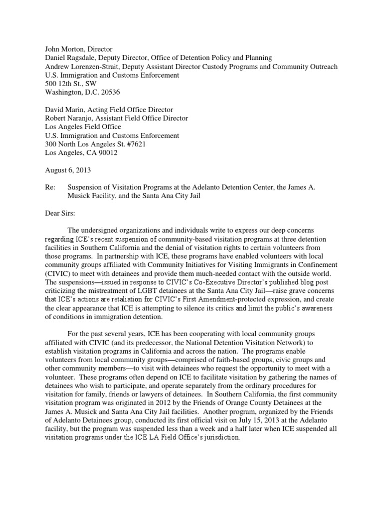 U.S. Immigration and Customs Enforcement 500 12th St., SW Washington, D.C. 20536 David Marin, Acting Field Office Director Robert Naranjo, Assistant Field Office Director Los Angeles Field Office U.S. Immigration and Customs Enforcement 300 North Los Angeles St. #7621 Los Angeles, CA 90012 August 6, 2013 Re: Suspension of Visitation Programs at the Adelanto Detention Center, the James A. Musick Facility, and the Santa Ana City Jail Dear Sirs: The undersigned organizations and individuals write to express our deep concerns