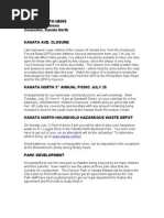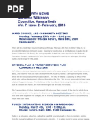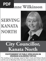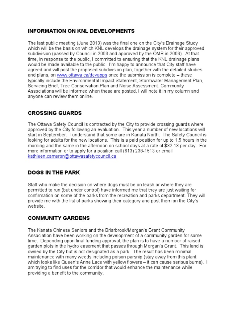 The last public meeting (June 2013) was the final one on the Citys Drainage Study which will be the basis on which KNL develops the drainage system for their approved subdivision (passed by Council in 2003 and approved by the OMB in 2006). At that time, in response to the public, I committed to ensuring that the KNL drainage plans would be made available to the public. Im happy to announce that City staff have agreed and will post the proposed subdivision plan, together with the detailed studies and plans, on www.ottawa.ca/devapps once the submission is complete these typically include the Environmental Impact Statement, Stormwater Management Plan, Servicing Brief, Tree Conservation Plan and Noise Assessment. Community Associations will be informed when these are posted. I will note it in my column and anyone can review them online.
