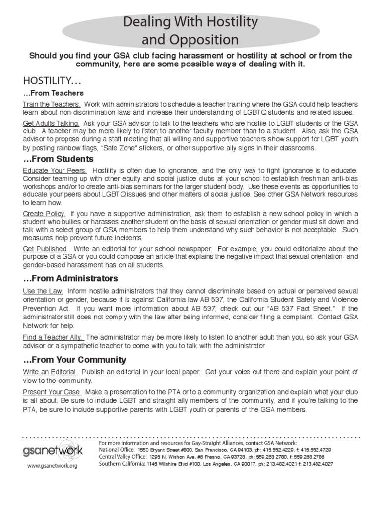 Should you find your GSA club facing harassment or hostility at school or from the community, here are some possible ways of dealing with it.