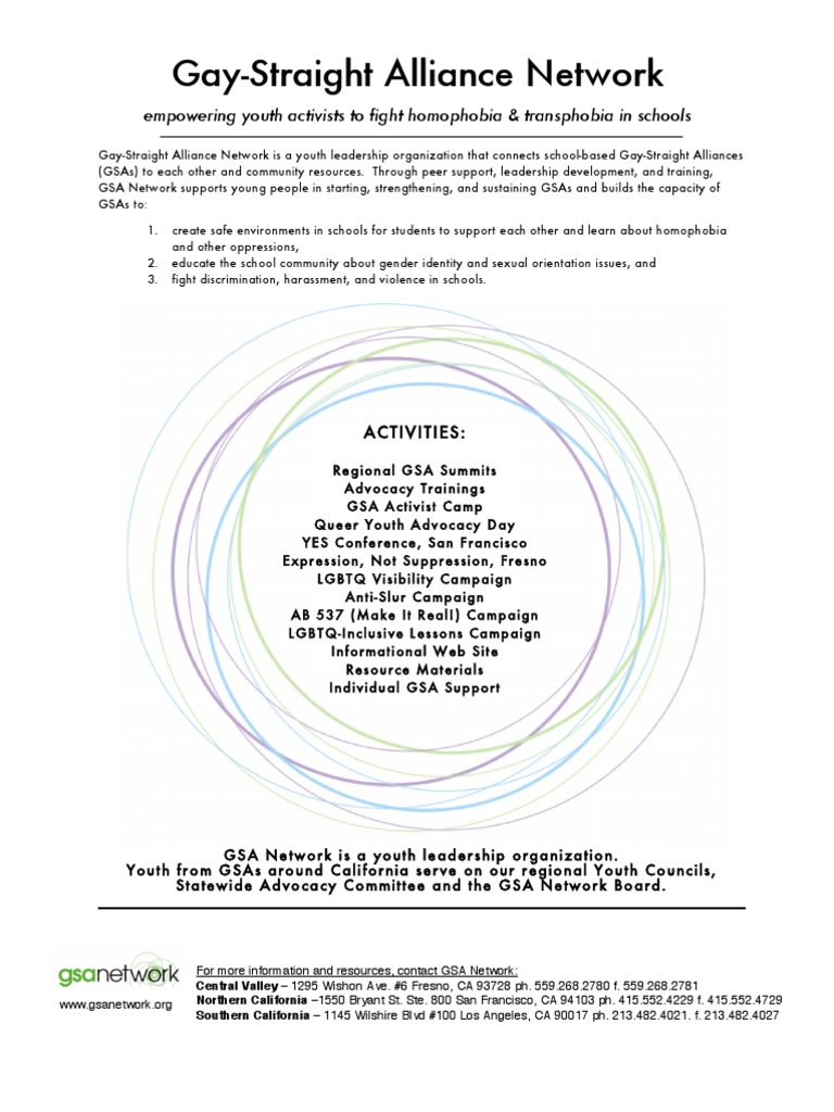 Gay-Straight Alliance Network is a youth leadership organization that connects school-based Gay-Straight Alliances (GSAs) to each other and community resources. Through peer support, leadership development, and training, GSA Network supports young people in starting, strengthening, and sustaining GSAs and builds the capacity of GSAs to: 1.