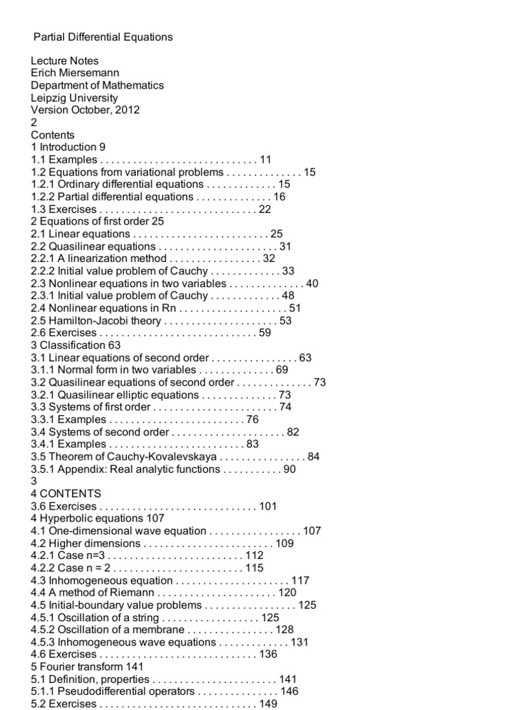 [22] A. Sommerfeld, Partielle Differentialgleichungen. Geest & Portig, Leipzig, 1954. [23] W. A. Strauss, Partial Differential equations. An Introduction. Second edition, Wiley-Interscience, 2008. German translation: Partielle Differentialgleichungen. Vieweg, 1995. BIBLIOGRAPHY 203 [24] M. E. Taylor, Pseudodifferential operators. Princeton, New Jersey, 1981. [25] G. N.Watson, A treatise on the Theory of Bessel Functions. Cambridge, 1952. [26] P.Wilmott, S. Howison and J. Dewynne, The Mathematics of Financial Derivatives, A Student Introduction. Cambridge University Press, 1996. [27] K. Yosida, Functional Analysis. Grundlehren, Vol. 123, Springer-Verlag, Berlin, 1965. Index dAlembert formula 108 asymptotic expansion 84 basic lemma 16 Beltrami equations Black-Scholes equation 164 Black-Scholes formulae 165, 169 boundary condition 14, 15 capillary equation 21 Cauchy-Kowalevskaya theorem 63, 84 Cauchy-Riemann equations 13 characteristic equation 28, 33, 41, 47, 74 characteristic curve 28 characteristic strip 47 classification linear equations second order 63 quasilinear equations second order 73 systems first order 74 cylinder surface 29 diffusion 163 Dirac distribution 177 Dirichlet integral 17 Dirichlet problem 181 domain of dependence 108, 115 domain of influence 109 elliptic 73, 75 nonuniformly elliptic 73 second order 175 system 75, 82 uniformly elliptic 73 Euler-Poisson-Darboux equation 111 Euler equation 15, 17 first order equations 25 two variables 40 Rn 51 Fourier transform 141 inverse Fourier transform 142 Fouriers method 126, 162 functionally dependent 13