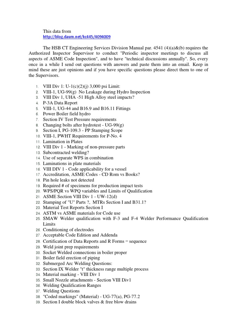 89. VIII Div 1 purpose of final pressure test 90. VIII Div 1 impact test requirements for UG-11 manway assemblies. 91. B31 Socket Weld Fitting Fit-Up Gap 92. Where in the ASME Code are international materials listed? 93. VIII Div 1, UG-10 and identical ASTM material 94: VIII Div 1 - UW-16(c) - Nozzle attachment welds, full penetration? 95: Titanium not reported as an unspecified element as required by SA-20 par. [Link] 96: ASME Section I - difference between tube and pipe