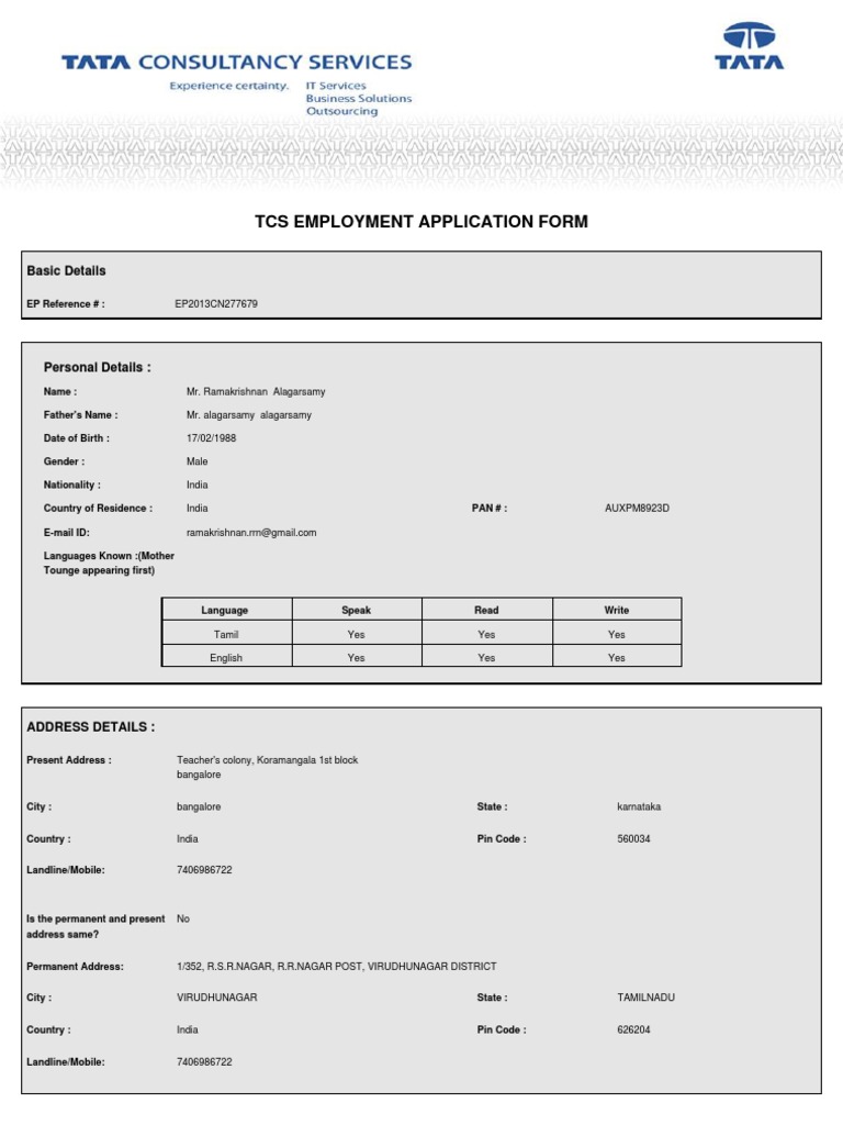 As a condition of Company's consideration of my application for employment with the Company, I hereby give my consent to the Company to investigate or cause to be investigated through any third parties my personal, educational and pre or post employment history. I understand that the background investigation will include, but not be limited to, verification of all information given by me to the Company. I confirm that the Company is entitled to share such investigation report with its clients to the extent necessary in connection with the Services, which I may be required to provide to such clients. I confirm and undertake that the Company shall incur no liability or obligation of any nature whatsoever resulting from such investigation or sharing of the investigation results as above. I certify that I am at present in sound mental and physical condition to undertake employment with TCS. I also declare that there is no criminal case filed against me or pending against me in any Court of law in India or abroad and no restrictions are placed on my travelling anywhere in India or abroad for the purpose of business of the company. Your Electronic Signature is : Name : Mr. Ramakrishnan Alagarsamy Date :Wed, 10 Apr 2013 Place :bangalore