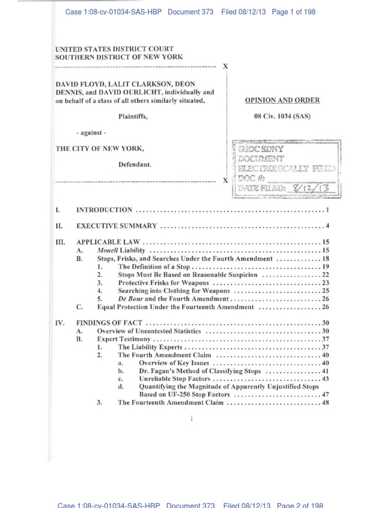 I begin with an Executive Summary of the most important points in the Opinion. Next, I address the legal standards governing the ability of police to conduct stops and frisks. I provide a statistical overview of the 4.4 million stops made between January 2004 and June 2012, followed by a discussion of the expert analyses of those stops. I then address the question of whether the City had notice of allegations of racial profiling in the conduct of stops and frisks, and the institutional response to that notice in terms of monitoring, supervision, training, and discipline. After addressing these big picture issues, I make findings of fact with respect to each of the nineteen stops of the twelve class members who provided testimony at trial. Finally, I present my conclusions of law based on my findings of fact. I will address the question of remedies in a separate opinion, because the remedies overlap with a different case involving stop and frisk in which I have already found that preliminary injunctive relief is warranted.7 It is important that this Opinion be read synergistically. Each section of the Opinion is only a piece of the overall picture. Some will quarrel with the findings in one section or another. But, when read as a whole, with an understanding of the interplay between each section, I hope that this Opinion will bring more clarity and less disagreement to this complex and sensitive issue. II. EXECUTIVE SUMMARY Plaintiffs assert that the City, and its agent the NYPD, violated both the Fourth Amendment and the Equal Protection Clause of the Fourteenth Amendment of the United States Constitution. In order to hold a municipality liable for the violation of a constitutional right,