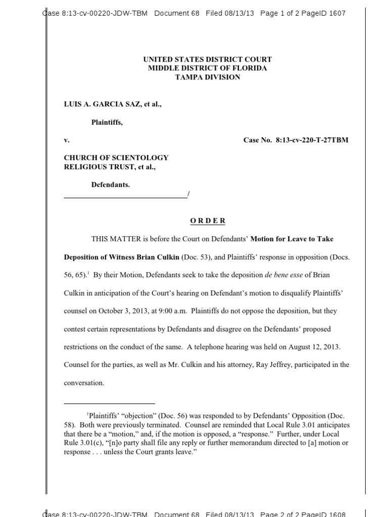 UNITED STATES DISTRICT COURTMIDDLE DISTRICT OF FLORIDATAMPA DIVISION LUIS A. GARCIA SAZ, et al.,Plaintiffs,v. Case No. 8:13-cv-220-T-27TBMCHURCH OF SCIENTOLOGY RELIGIOUS TRUST, et al.,Defendants. / O R D E R