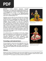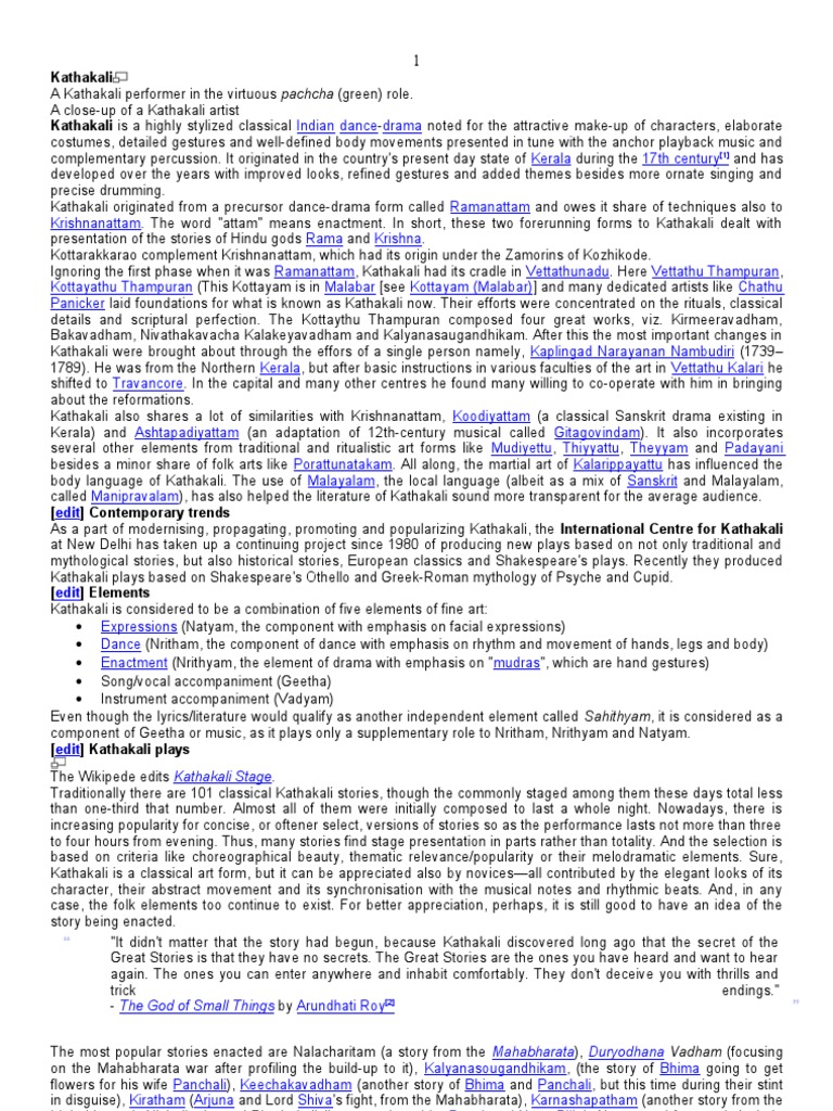 Kathakali A Kathakali performer in the virtuous pachcha (green) role. A close-up of a Kathakali artist Kathakali is a highly stylized classical Indian dance-drama noted for the attractive make-up of characters, elaborate costumes, detailed gestures and well-defined body movements presented in tune with the anchor playback music and complementary percussion. It originated in the country's present day state of Kerala during the 17th century[1] and has developed over the years with improved looks, refined gestures and added themes besides more ornate singing and precise drumming. Kathakali originated from a precursor dance-drama form called Ramanattam and owes it share of techniques also to Krishnanattam. The word "attam" means enactment. In short, these two forerunning forms to Kathakali dealt with presentation of the stories of Hindu gods Rama and Krishna. Kottarakkarao complement Krishnanattam, which had its origin under the Zamorins of Kozhikode. Ignoring the first phase when it was Ramanattam, Kathakali had its cradle in Vettathunadu. Here Vettathu Thampuran, Kottayathu Thampuran (This Kottayam is in Malabar [see Kottayam (Malabar)] and many dedicated artists like Chathu Panicker laid foundations for what is known as Kathakali now. Their efforts were concentrated on the rituals, classical details and scriptural perfection. The Kottaythu Thampuran composed four great works, viz. Kirmeeravadham, Bakavadham, Nivathakavacha Kalakeyavadham and Kalyanasaugandhikam. After this the most important changes in Kathakali were brought about through the effors of a single person namely, Kaplingad Narayanan Nambudiri (1739 1789). He was from the Northern Kerala, but after basic instructions in various faculties of the art in Vettathu Kalari he shifted to Travancore. In the capital and many other centres he found many willing to co-operate with him in bringing about the reformations. Kathakali also shares a lot of similarities with Krishnanattam, Koodiyattam (a classical Sanskrit drama existing in Kerala) and Ashtapadiyattam (an adaptation of 12th-century musical called Gitagovindam). It also incorporates several other elements from traditional and ritualistic art forms like Mudiyettu, Thiyyattu, Theyyam and Padayani besides a minor share of folk arts like Porattunatakam. All along, the martial art of Kalarippayattu has influenced the body language of Kathakali. The use of Malayalam, the local language (albeit as a mix of Sanskrit and Malayalam, called Manipravalam), has also helped the literature of Kathakali sound more transparent for the average audience. [edit] Contemporary trends As a part of modernising, propagating, promoting and popularizing Kathakali, the International Centre for Kathakali at New Delhi has taken up a continuing project since 1980 of producing new plays based on not only traditional and mythological stories, but also historical stories, European classics and Shakespeare's plays. Recently they produced Kathakali plays based on Shakespeare's Othello and Greek-Roman mythology of Psyche and Cupid. [edit] Elements Kathakali is considered to be a combination of five elements of fine art: Expressions (Natyam, the component with emphasis on facial expressions) Dance (Nritham, the component of dance with emphasis on rhythm and movement of hands, legs and body) Enactment (Nrithyam, the element of drama with emphasis on "mudras", which are hand gestures) Song/vocal accompaniment (Geetha) Instrument accompaniment (Vadyam) Even though the lyrics/literature would qualify as another independent element called Sahithyam, it is considered as a component of Geetha or music, as it plays only a supplementary role to Nritham, Nrithyam and Natyam. [edit] Kathakali plays The Wikipede edits Kathakali Stage. Traditionally there are 101 classical Kathakali stories, though the commonly staged among them these days total less than one-third that number. Almost all of them were initially composed to last a whole night. Nowadays, there is increasing popularity for concise, or oftener select, versions of stories so as the performance lasts not more than three to four hours from evening. Thus, many stories find stage presentation in parts rather than totality. And the selection is based on criteria like choreographical beauty, thematic relevance/popularity or their melodramatic elements. Sure, Kathakali is a classical art form, but it can be appreciated also by novicesall contributed by the elegant looks of its character, their abstract movement and its synchronisation with the musical notes and rhythmic beats. And, in any case, the folk elements too continue to exist. For better appreciation, perhaps, it is still good to have an idea of the story being enacted. "It didn't matter that the story had begun, because Kathakali discovered long ago that the secret of the Great Stories is that they have no secrets. The Great Stories are the ones you have heard and want to hear again. The ones you can enter anywhere and inhabit comfortably. They don't deceive you with thrills and trick endings." - The God of Small Things by Arundhati Roy[2] The most popular stories enacted are Nalacharitam (a story from the Mahabharata), Duryodhana Vadham (focusing on the Mahabharata war after profiling the build-up to it), Kalyanasougandhikam, (the story of Bhima going to get flowers for his wife Panchali), Keechakavadham (another story of Bhima and Panchali, but this time during their stint in disguise), Kiratham (Arjuna and Lord Shiva's fight, from the Mahabharata), Karnashapatham (another story from the Mahabharata), Nizhalkuthu and Bhadrakalivijayam authored by Pannisseri Nanu Pillai. Also staged frequently include