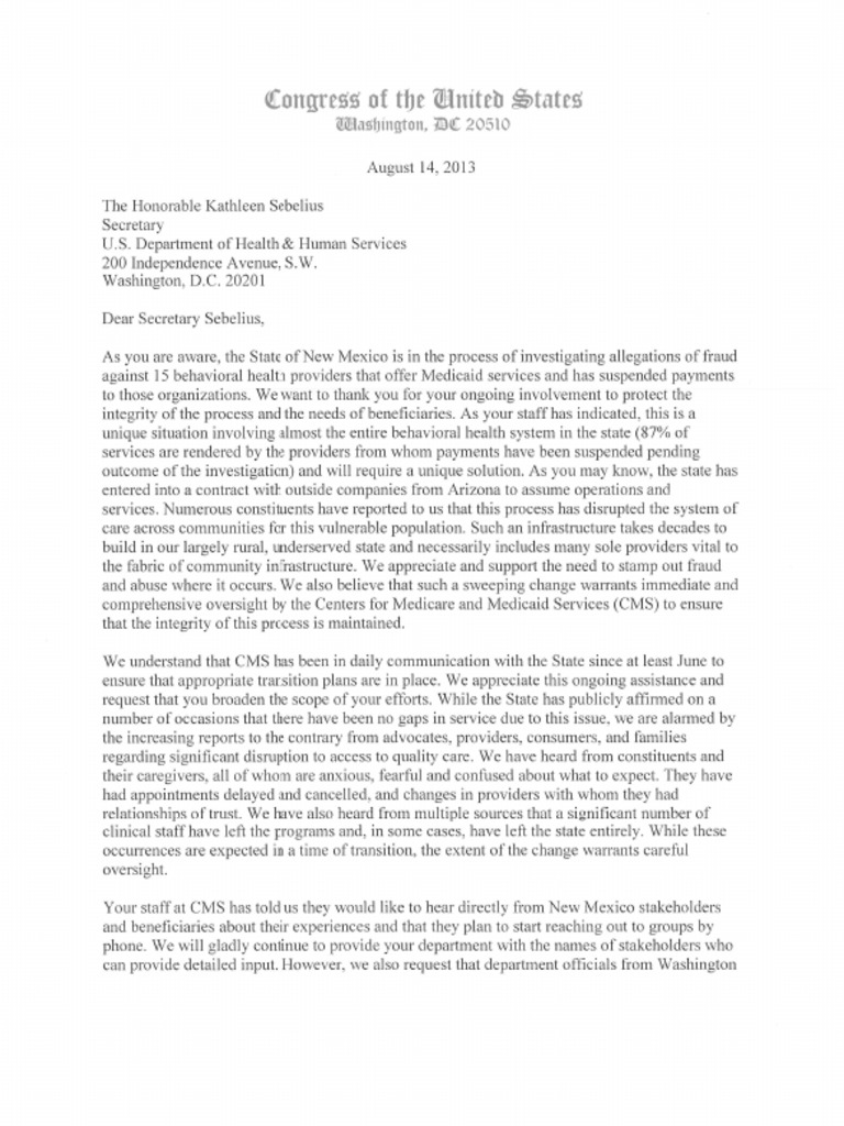 U.S. Senators Tom Udall and Martin Heinrich, along with Reps. Ben Ray Luján and Michelle Lujan Grisham call on the U.S. Department of Health & Human Services Secretary Kathleen Sebelius hold a public forum in New Mexico so constituents can provide detailed input and feedback about the level of services they are receiving as a result of changes in Medicaid service providers.