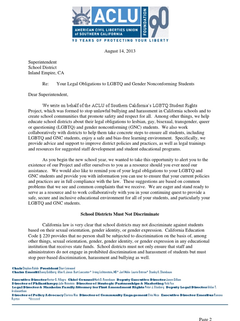 We write on behalf of the ACLU of Southern California’s LGBTQ Student Rights
