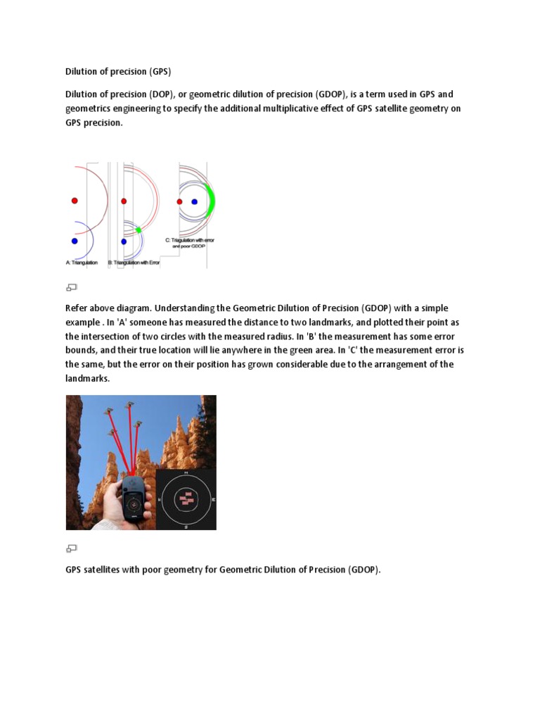 Dilution of precision (GPS) Dilution of precision (DOP), or geometric dilution of precision (GDOP), is a term used in GPS and geometrics