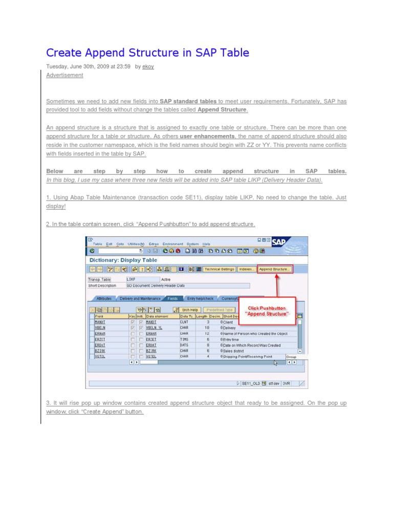 In this blog, I use my case where three new fields will be added into SAP table LIKP (Delivery Header Data). 1. Using Abap Table Maintenance (transaction code SE11), display table LIKP. No need to change the table. Just display! 2. In the table contain screen, click Append Pushbutton to add append structure.