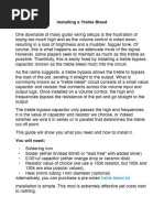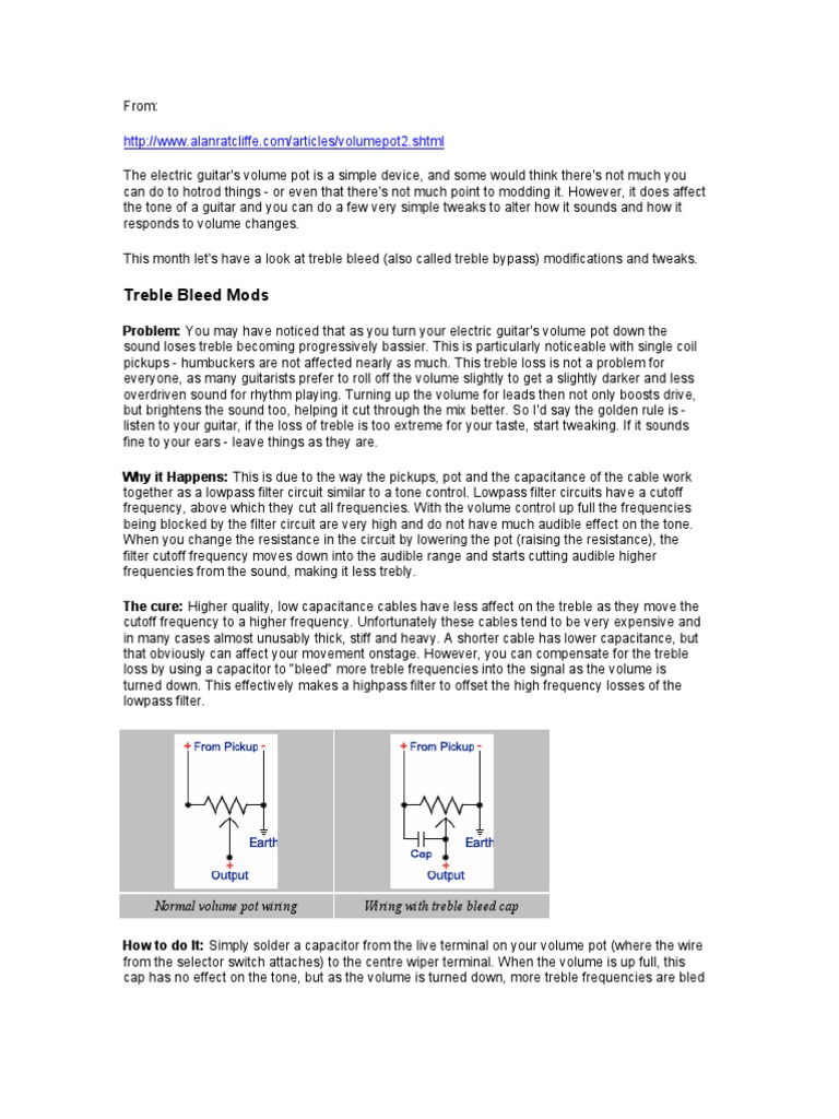 Normal volume pot wiring The downside: There is one small drawback to a simple treble bleed capacitor is that the guitar can actually become too bright as the volume is turned down. To offset this, a resistor in series with the cap will lower the amount of treble being bled through. Once again the exact value is impossible to predict for every situation, but resistance values between 50% - 100% of the pot value will usually do the trick. For the ultimate in tweakability, use a preset trimpot (a small pot which you can adjust and leave set at a fixed value) to set the exact amount of resistance you like.