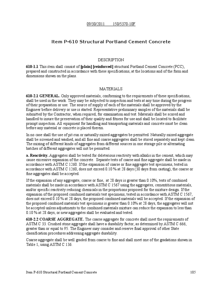 DESCRIPTION 610-1.1 This item shall consist of [plain] [reinforced] structural Portland Cement Concrete (PCC), prepared and constructed in accordance with these specifications, at the locations and of the form and dimensions shown on the plans. MATERIALS 610-2.1 GENERAL. Only approved materials, conforming to the requirements of these specifications, shall be used in the work. They may be subjected to inspection and tests at any time during the progress of their preparation or use. The source of supply of each of the materials shall be approved by the Engineer before delivery or use is started. Representative preliminary samples of the materials shall be submitted by the Contractor, when required, for examination and test. Materials shall be scored and handled to insure the preservation of their quality and fitness for use and shall be located to facilitate prompt inspection. All equipment for handling and transporting materials and concrete must be clean before any material or concrete is placed therein. In no case shall the use of pit-run or naturally mixed aggregates be permitted. Naturally mixed aggregate shall be screened and washed, and all fine and coarse aggregates shall be stored separately and kept clean. The mixing of different kinds of aggregates from different sources in one storage pile or alternating batches of different aggregates will not be permitted. a. Reactivity. Aggregates shall be tested for deleterious reactivity with alkalis in the cement, which may cause excessive expansion of the concrete. Separate tests of coarse and fine aggregate shall be made in accordance with ASTM C 1260. If the expansion of coarse or fine aggregate test specimens, tested in accordance with ASTM C 1260, does not exceed 0.10 % at 28 days (30 days from casting), the coarse or fine aggregates shall be accepted. If the expansion of any aggregate, coarse or fine, at 28 days is greater than 0.10%, tests of combined materials shall be made in accordance with ASTM C 1567 using the aggregates, cementitious materials, and/or specific reactivity reducing chemicals in the proportions proposed for the mixture design. If the expansion of the proposed combined materials test specimens, tested in accordance with ASTM C 1567, does not exceed 0.10 % at 28 days, the proposed combined materials will be accepted. If the expansion of the proposed combined materials test specimens is greater than 0.10% at 28 days, the aggregates will not be accepted unless adjustments to the combined materials mixture can reduce the expansion to less than 0.10 % at 28 days, or new aggregates shall be evaluated and tested. 610-2.2 COARSE AGGREGATE. The coarse aggregate for concrete shall meet the requirements of ASTM C 33. Crushed stone aggregate shall have a durability factor, as determined by ASTM C 666, greater than or equal to 95. The Engineer may consider and reserve final approval of other State classification procedures addressing aggregate durability. Coarse aggregate shall be well graded from coarse to fine and shall meet one of the gradations shown in Table 1, using ASTM C 136.