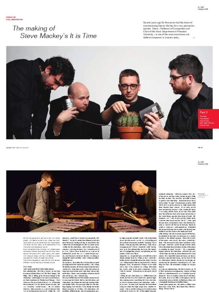 During the course of a year and a half, we worked closely with Steve to craft a new piece that highlights each of us as performers and interpreters. We found the end result to be astonishing in its innovation and conceptual power. Over this series of four articles, well dissect each movement through the eyes of the individual members of the group: Eric, Josh, Adam, and Jason. Well also talk about working with Steve to unlock the potential in each of these instruments. This article focuses on Josh Quillen and several different ways of looking at the steel drums. IT IS TIME: NEW GROUND FOR THE STEEL DRUM Our collaboration with Steve Mackey on the 2nd movement (Steel Drums) of It is Time began with BBQ. This is fitting, given that most things in the steel drum world happen over some sort of communal food experience in Trinidad and Tobago. What struck me the most about Steves way of learning the instrument was his desire to hear me play the way I naturally wanted to play. He was curious about my idiosyncrasies as a player because this was an instrument he had never written for. I often wonder: if he had written this for another steel