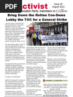 Paul Le Blanc, in his talk at Marxism, referred to three whales of Bolshevism, a notion that came out of an old Russian folk tale of the world being balanced on three whales. In Le Blancs talk, he stated that the Bolsheviks saw the whales in question as being three demands for them to agitate and organise around: an eight hour day, land reform in favour of the peasants, and a constituent assembly. This article argues that for the revolutionary left in Britain, there are similarly three whales the highly unionised public sector workers, the largely non-unionised private sector workers, and the social movements. Furthermore, I will suggest that the party has overbalanced its strategy too much towards the first of these at the expense of the latter two, and that this raises a number of important questions. Much of this article does little more than repeat what has been said elsewhere I make no claims to be an original thinker! However, I do want to offer a perspective in particular concerning the role of the social movements in Britain in comparison to other places internationally where there has been a high degree of struggle. Orientating on the public sector For the last two years, an orientation on the public sector, and specifically on the bureaucracy of the public sector trade unions, has been central to the SWPs strategy. There is no question that, at least initially, this turn by the party was the right one. It allowed us to have substantial influence in pushing for a fight in 2011, leading to the huge protest on 26 March, the joint strike by five unions on 30 June, and the magnificent show of strength on 30 November, thrown away by the trade union leadership just days later. However, although that analysis was correct for that time, once the sell-out occurred there was no real attempt to take stock and review our strategy in light of the changed situation. The leadership analysed that the root of the problem, at least in immediate terms, was due in part to the nature of the trade union bureaucracy, which will seek to limit struggle for fear of losing control, and the current lack of confidence among the rank and file to fight without support and approval from their leaders. But rather than looking to reorient, the party merely continued with the existing strategy in the hope that something would happen as Mike Gonzalez wrote in a recent article. There was a denial of the fact that the strike wave and accompanying demonstrations, although a result of pressure from below, were essentially bureaucratic in character and thus easily turned off by the bureaucracy. And there was a continued insistence that a new upturn was round the corner, culminating in predictions of a hot autumn in 2012 which failed to materialise.