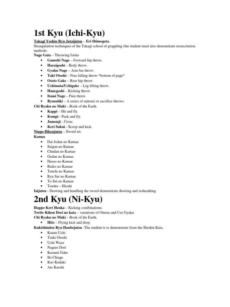 Takagi Yoshin Ryu Jutaijutsu Eri Shimegata. Strangulation techniques of the Takagi school of grappling (the student must also demonstrate resuscitation methods. Nage Gata Throwing forms Ganseki Nage Forward hip throw. Haraigoshi Body throw. Gyaku Nage Arm bar throw. Taki Otoshi Free falling throw.*bottom of page* Osoto Gake Rear hip throw. Uchimata/Uchigake Leg lifting throw. Hanegoshi Kicking throw. Itami Nage Pain throw. Ryusuiiki A series of suitemi or sacrifice throws. Chi Ryaku no Maki Book of the Earth. Kappi Hit and fly. Kompi - Pack and fly. Jumonji - Cross. Keri Sukui - Scoop and kick. Ninpo Bikenjutsu Sword art. Kamae Dai Jodan no Kamae Seigan no Kamae Chudan no Kamae Gedan no Kamae Hasso no Kamae Raiko no Kamae Tenchi no Kamae Ryu Sui no Kamae To Sui no Kamae Totoku Hioshi Iaijutsu - Drawing and handling the sword demonstrate drawing and resheathing