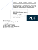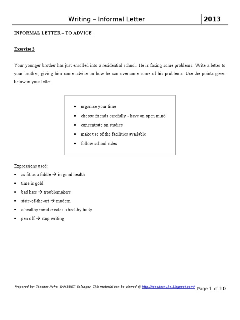 5, Jalan Parameswara, 77000 Jasin, Melaka. 16 January 2011 Dearest ______________, I hope you 1) are as fit as a fiddle and not too homesick. All of us are fine back home although we 2) miss having you around. I especially miss you as I no longer have anyone to 3) play badminton with. In your last letter, you 4) told me that youre having some difficulties in your new school. As you may already know, life in residential school 5) is very different from home. It is more difficult and you may 6) face many problems. 7) However, dont fret too much because all these problems can be overcome. First, make sure that you organise your time 8) wisely because time is gold. Divide your time for doing homework, studying, 9) washing clothes and so on. I suggest that you have 10) a timetable. So, you may find 11) it easier to finish all that you have to do and still have some free time for yourself. Next, please do be careful 12) in your choice of friends. There 13) are bound to be some bad hats around. So, make sure that youre not 14) influenced by the wrong set of friends. Stay away from any unhealthy 15) activities such as smoking or drug abuse. These 16) habits will only lead to disaster and jeopardize your studies. You will 17) meet friends from various cultures and backgrounds. So, please keep 18) an open mind. Dont 19) belittle anyone elses beliefs or traditions. At the same time, dont forget all that you have 20) learnt at home. The main reason you were sent there 21) is to help you get better results and hopefully a scholarship. 22) Therefore, concentrate on your studies and do well in your examinations. This is your best chance to