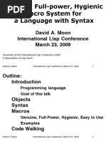 body of the d e f m a c r oform, which is just Lisp code; the only catch is that the Lisp system expects the macro expander to return a Lisp form. The Lisp system then evaluates whatever form the macro expander returns. A Lisp implementation may expand macros at different times. A macro could be expanded just once, when your program is compiled. Or it could be expanded on first use as your program runs, and the expansion could be cached for subsequent reuse. A properly written macro will behave the same under all of these implementations. Lets explore a real-world example of using a macro to extend Lisp into the problem domain. In addition to providing a macro expander, our new macro will automatically generate an environment that will be referenced by the expander. Our example will show how to move computations from run-time to compile-time, and how to share information computed at compiletime. Lets say youre working on an interactive game that makes heavy use of the trigonometric function sin r in computing player motion and interaction. Youve already determined that calling the Lisp function sin is too time-consuming; you also know that your program will work just fine with approximate results for the computation of sin r. Youd like to define a lookup-sin macro to do the table lookup at runtime and also hide the details of table generation, which would just clutter your programs source code. Your macro will be invoked as (lookup-sin radians divisions), where radians is always in the range of zero to one-half pi, and divisions is the number of discrete values available as the result of lookup-sin. At runtime, the macro expander will just compute the index into a lookup table, and return the value from the table. The table will be generated at compile-time (on most Lisp systems). Furthermore, only one table will ever be generated for a given value of divisions in the macro call.